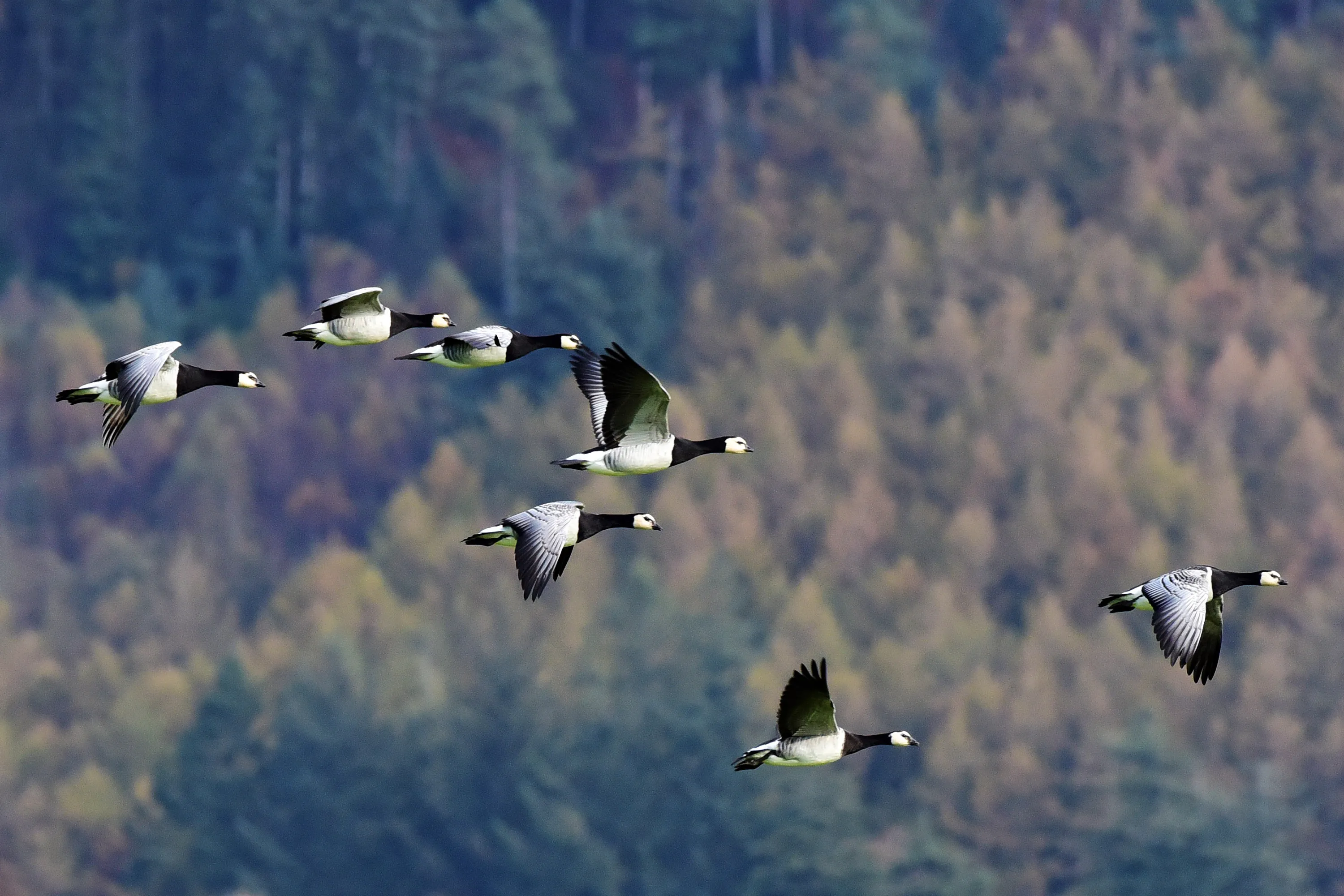 Barnacle geese fly above the RSPB Mersehead reserve on the Solway Firth, on October 15, 2018 in Dumfries, Scotland. Tens of thousands of barnacle geese return to the Solway each autumn from their breeding grounds in the Svalbard archipelago inside the arctic circle. (Photo by Ken Jack — Corbis/Getty Images)