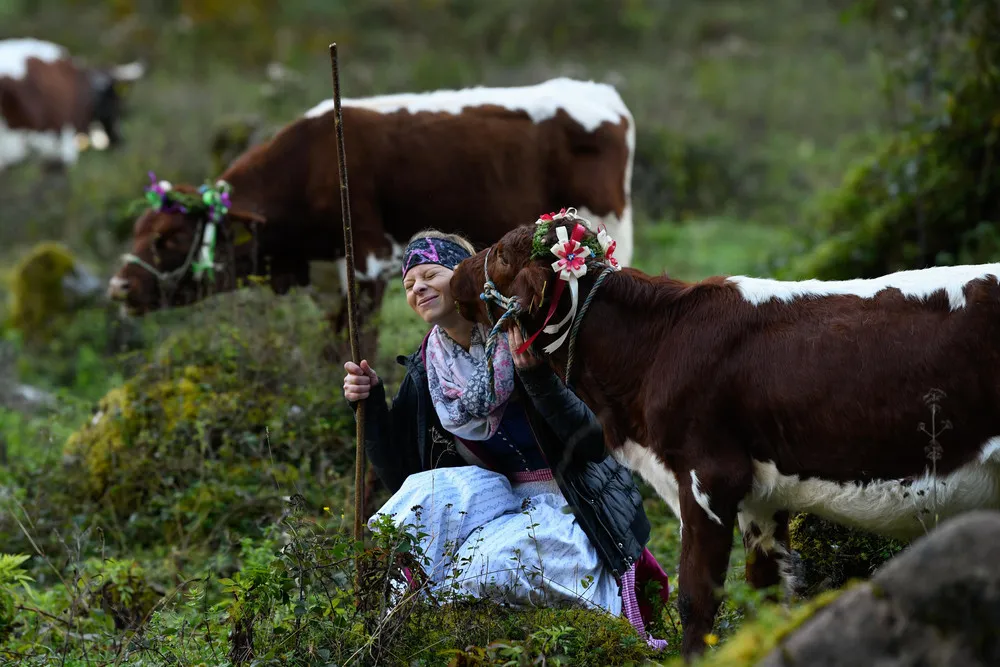 A young woman takes cows to a boat that takes them over the Koenigssee Lake during the annual ceremonial cattle drive, called an Almabtrieb, on October 6, 2018 at Schoenau am Koenigssee near Berchtesgaden, Germany. Farmers herd the cattle down from alpine, summer pastures and transport them across Koenigssee lake in order to bring them to barns for the winter. (Photo by Andreas Gebert/Getty Images)