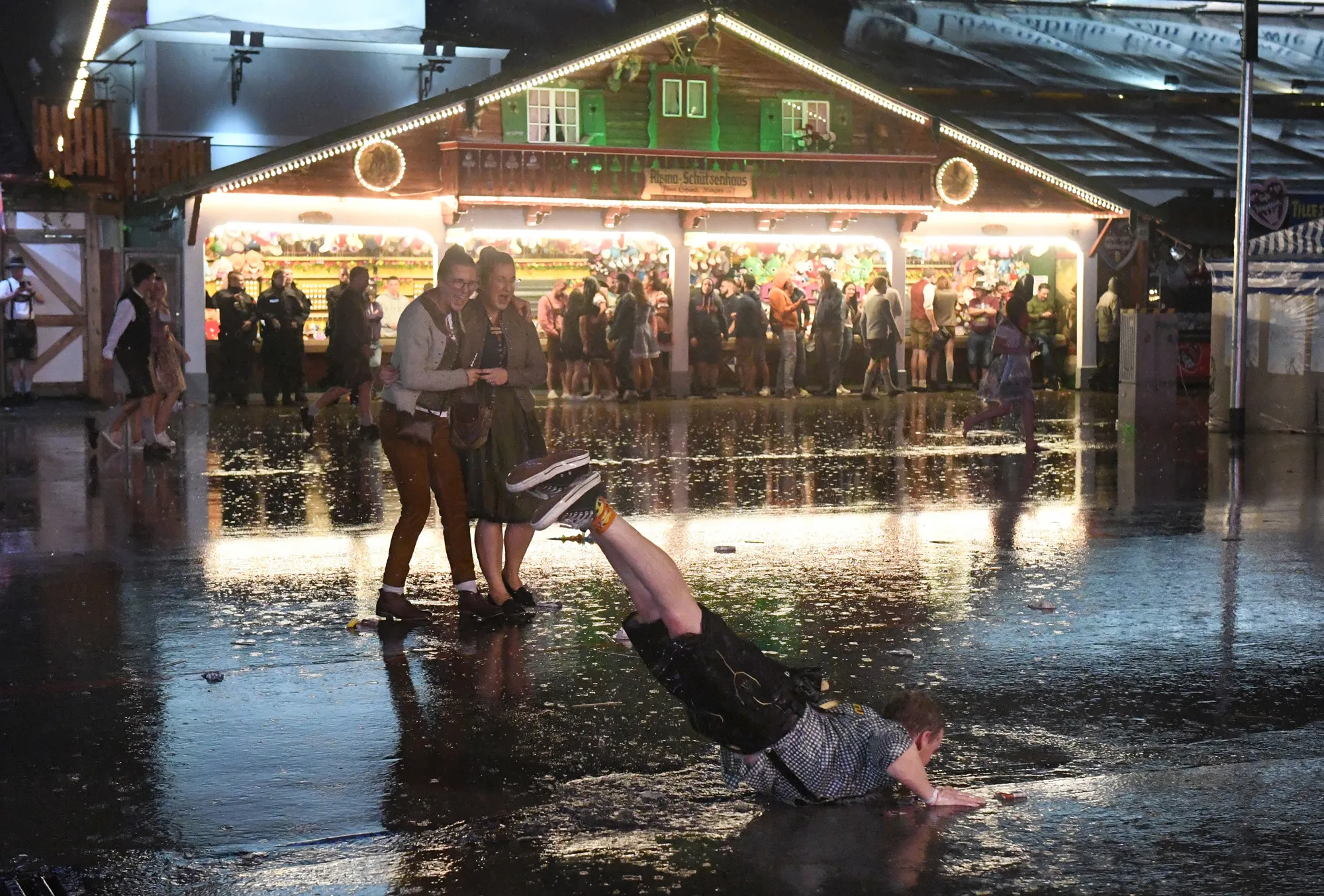 A visitor to the Oktoberfest takes a bath in a puddle while Sturmtief Fabienne is passing through in Bavaria, Munich on September 23, 2018. The world's largest fair lasts from 22.09. to 07.10.2018. (Photo by Felix Hörhager/DPA/Picture Alliance via Getty Images)