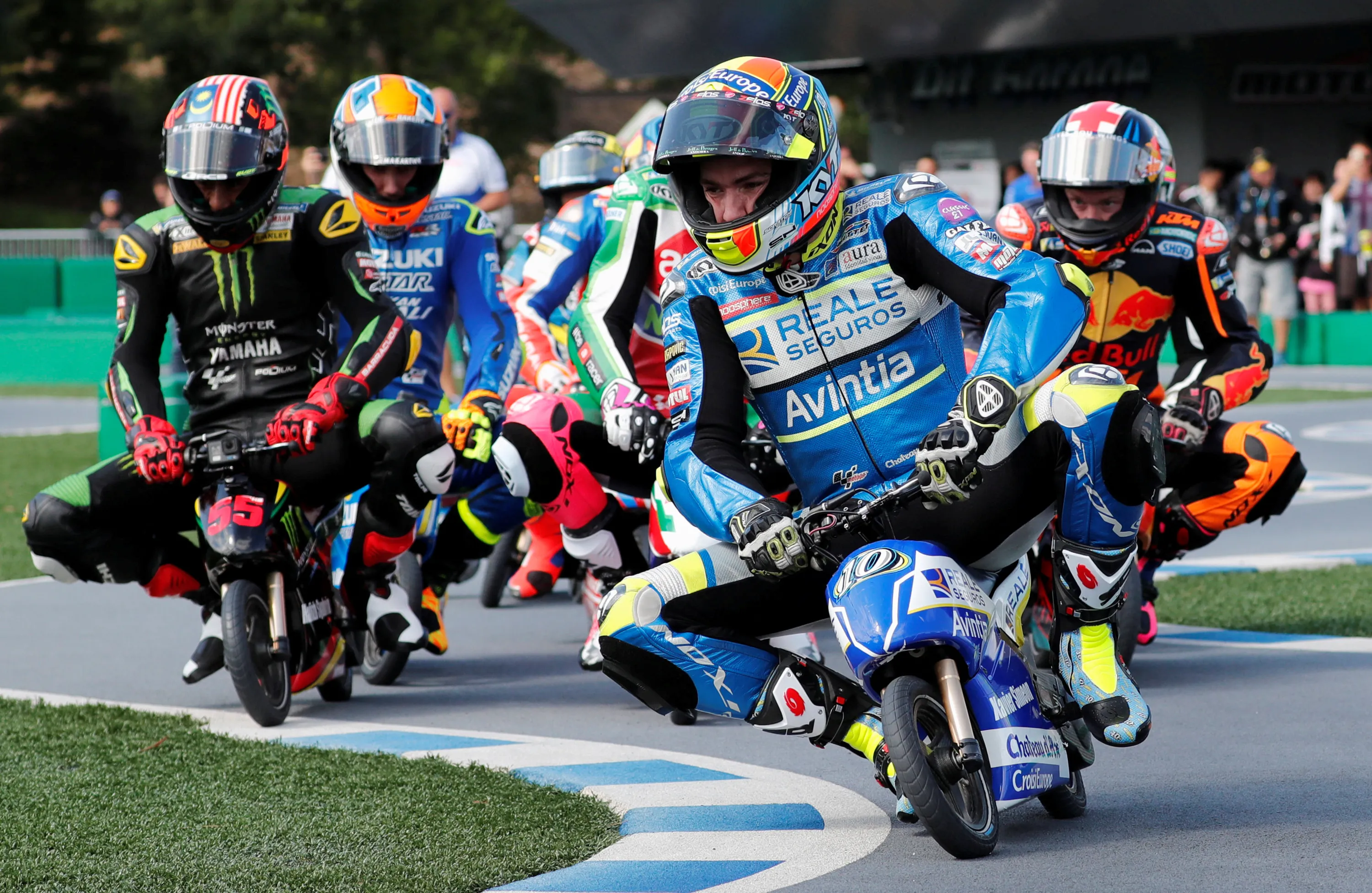 Xavier Simeon of Belgium (front) and other MotoGP riders ride mini electric bikes during the pre-event “Minimotos Traditional Challenge” during the MotoGP of Japan — Previews at Twin Ring Motegi on October 18, 2018 in Motegi, Japan. (Photo by Toru Hanai/Reuters)