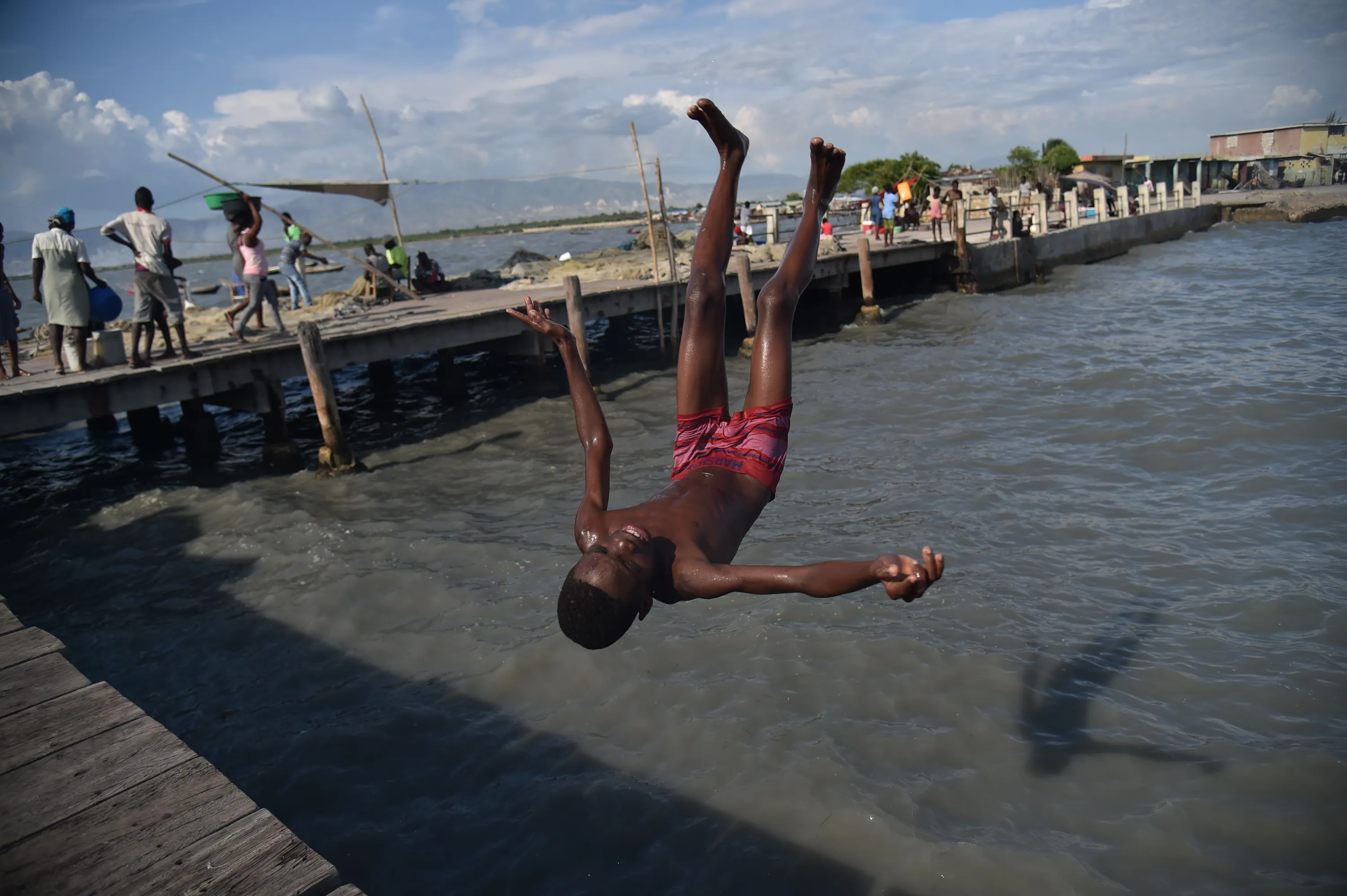 A boy jumps into the sea while playing with friends near Wharf Soleil in the Cite Soleil neighborhood of Port- au- Prince, Haiti, on August 28, 2018. (Photo by Hector Retamal/AFP Photo)