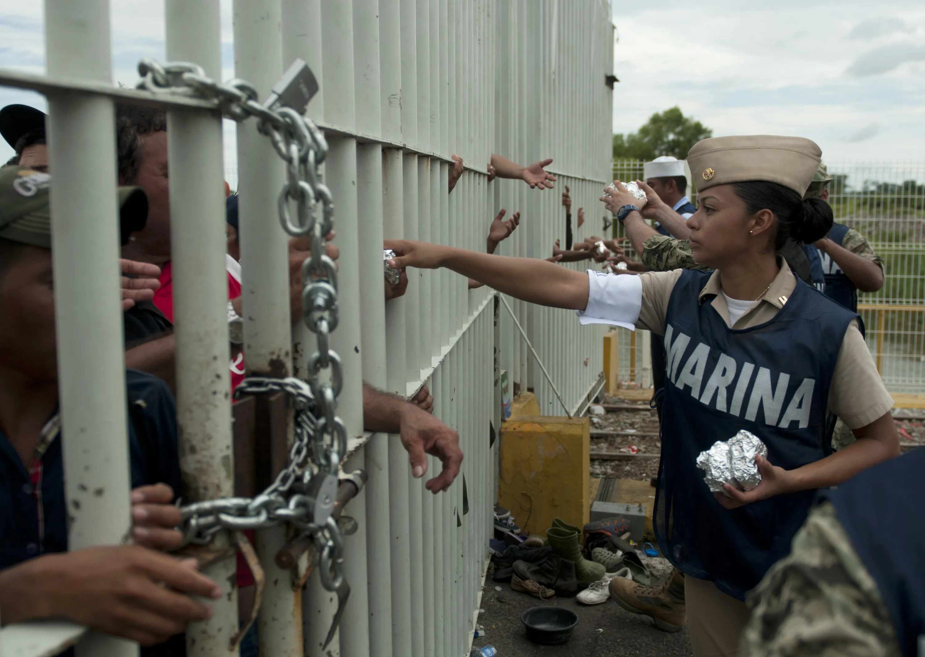 Mexican navy personnel hand out food to Central American migrants stuck in no man's land on the bridge over the Suchiate River that is the border between Guatemala and Mexico, near Ciudad Hidalgo, Mexico, Saturday, October 20, 2018. The entry into Mexico via the bridge has been closed. The migrants have moved about 30 feet back from the gate that separates them from Mexican police to establish a buffer zone. About 1,000 migrants now remain on the bridge between Guatemala and Mexico. (Photo by Oliver de Ros/AP Photo)