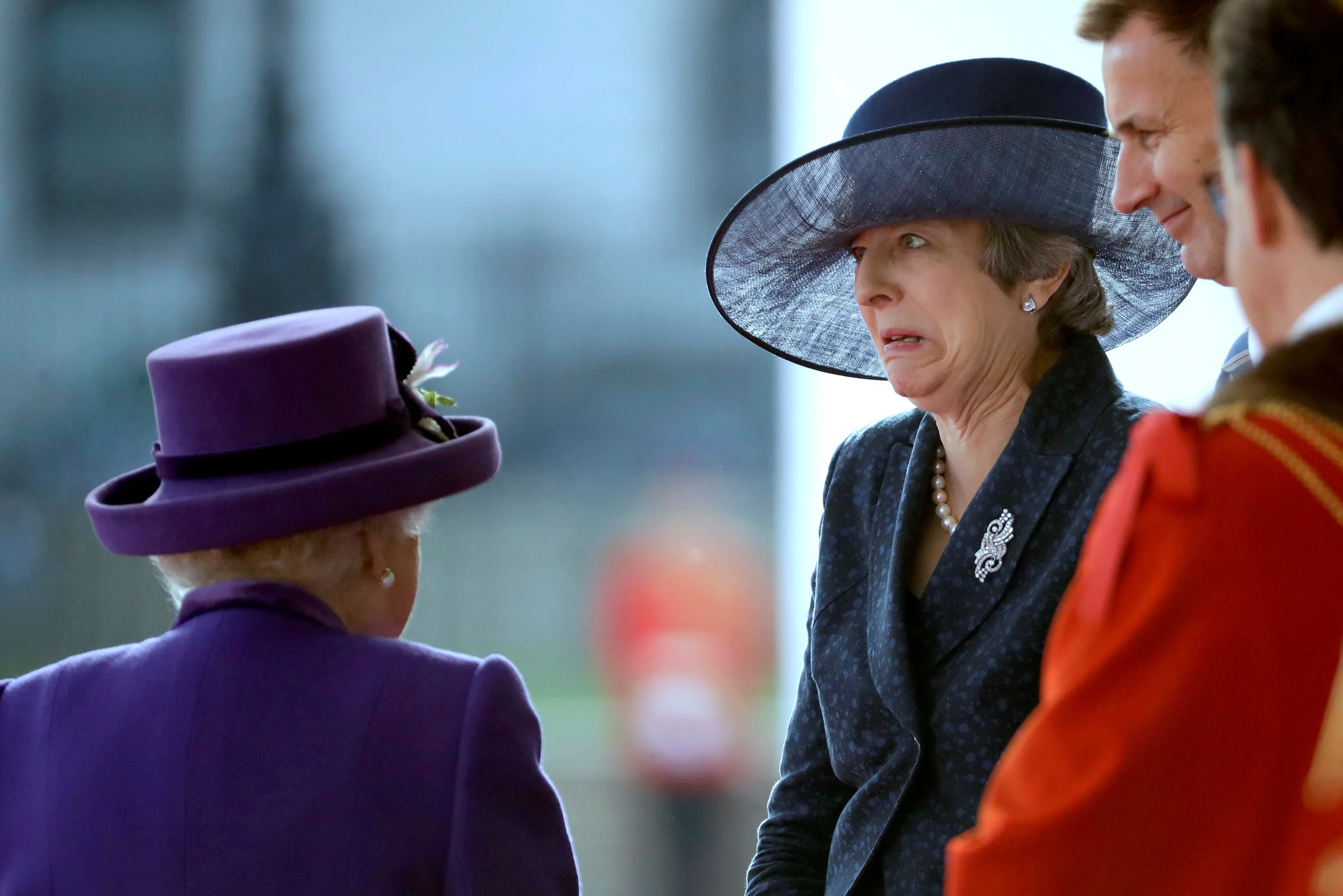 Britain's Prime Minister Theresa May talsk to Queen Elizabeth as they wait to greet King Willem-Alexander and his wife Queen Maxima of the Netherlands at a Ceremonial Welcome during a state visit, in London, Britain October 23, 2018. (Photo by Matt Dunham/Pool via Reuters)