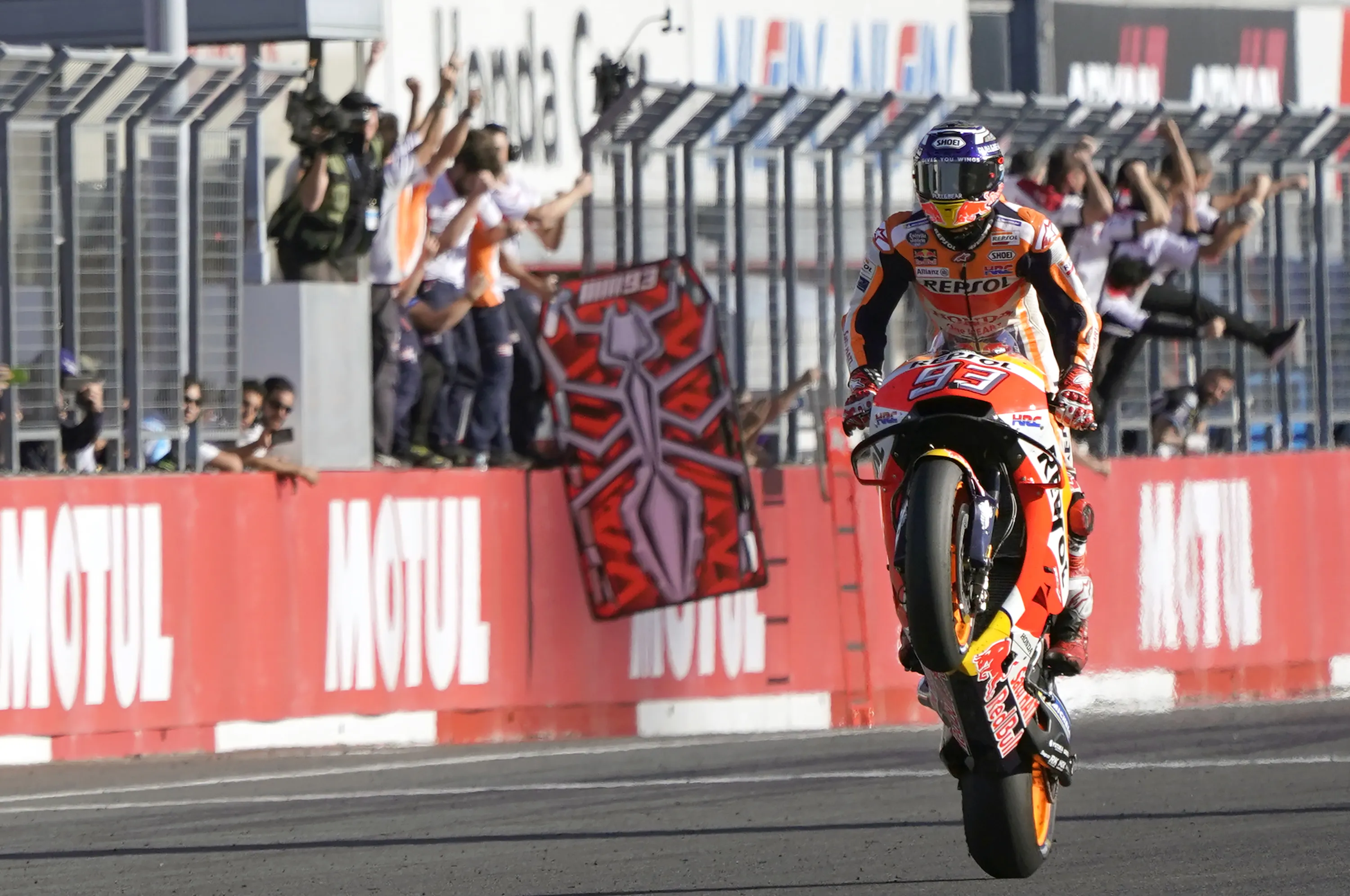 In this October 21, 2018, photo, Spain's rider Marc Marquez celebrates after crossing the finish line to win the MotoGP Japanese Motorcycle Grand Prix at the Twin Ring Motegi circuit in Motegi, north of Tokyo. (Photo by Shizuo Kambayashi/AP Photo)