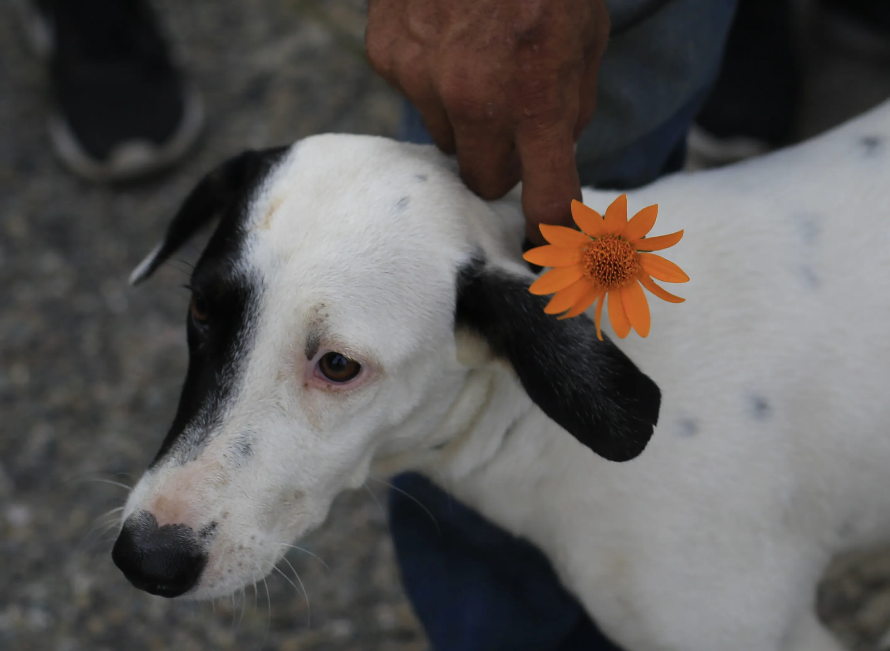 A migrant from Bolivia tries to put a flower on his dog “Nena”, who he has been traveling with for almost two months since meeting her in Nicaragua, as a caravan of thousands of Central Americans waits on the highway after Mexican police blocked the road, outside the town of Arriaga, Mexico, Saturday, October 27, 2018. Hundreds of Mexican federal officers carrying plastic shields briefly blocked the caravan of Central American migrants from continuing toward the United States, after several thousand of the migrants turned down the chance to apply for refugee status and obtain a Mexican offer of benefits. (Photo by Rebecca Blackwell/AP Photo)