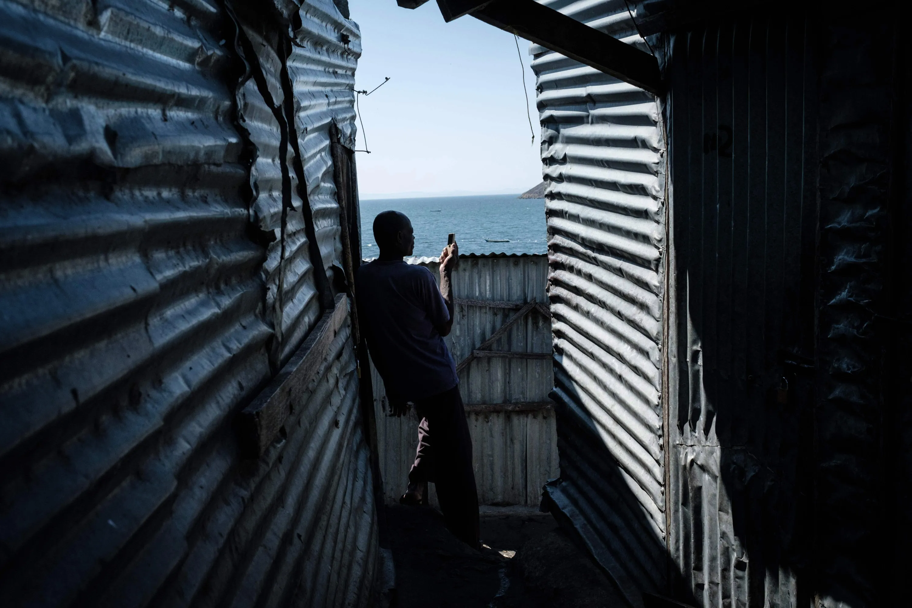 A man uses his mobile phone on Migingo island on October 5, 2018 which is densely populated by residents fishing mainly for Nile perch in Lake Victoria on the border of Uganda and Kenya. (Photo by Yasuyoshi Chiba/AFP Photo)