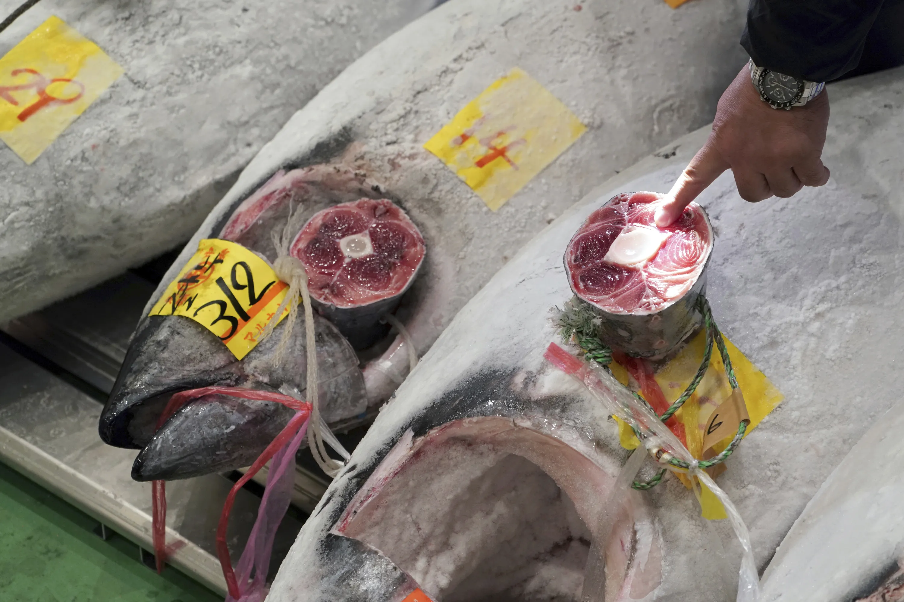 A prospective buyer checks a frozen tuna during the first auction at the newly opened Toyosu Market, new site of Tokyo's fish market, in Tokyo Thursday, October 11, 2018.Tokyo's famous fish market reopened Thursday at a new location but with an old tradition: the tuna auction. (Photo by Eugene Hoshiko/AP Photo)