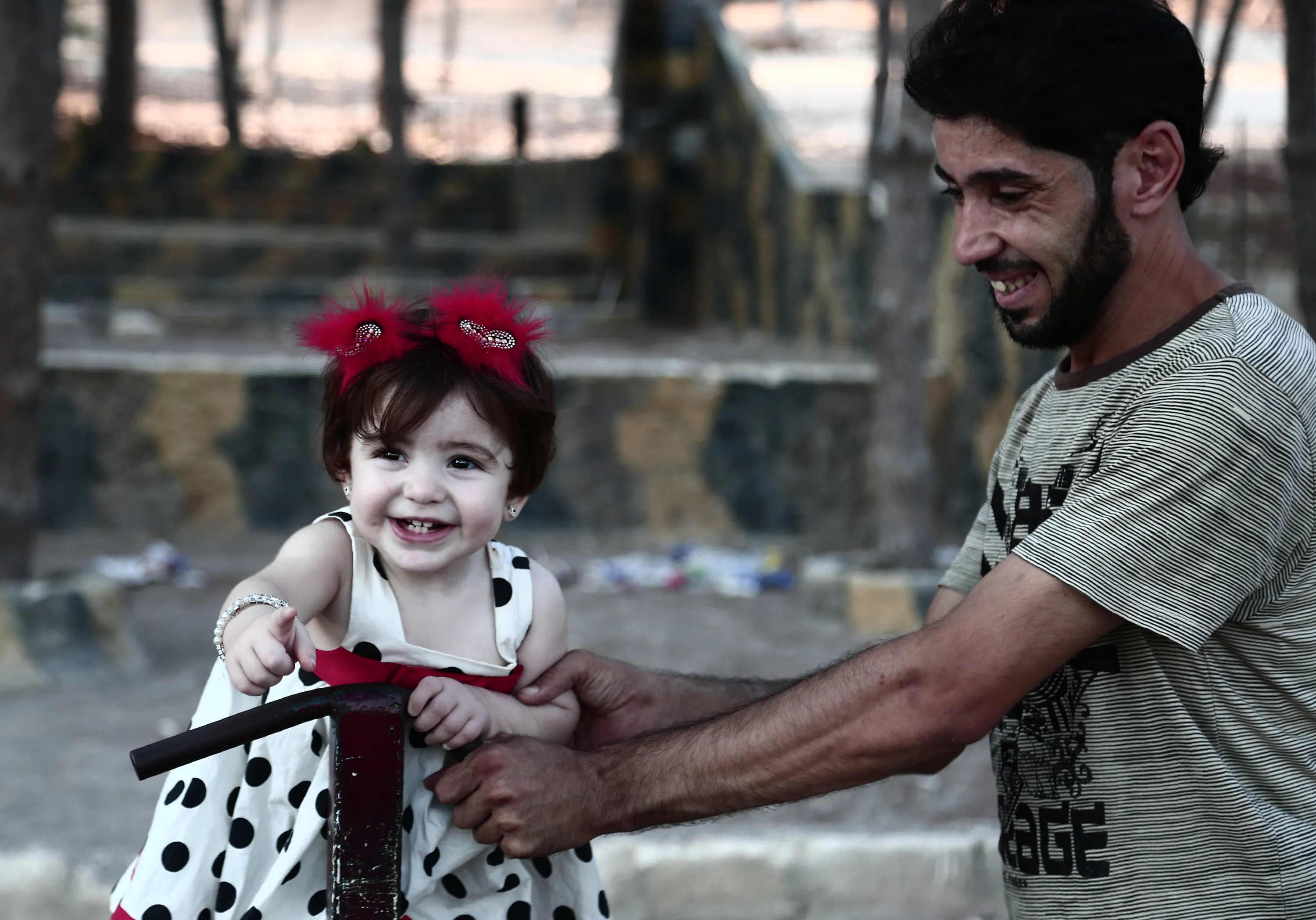 A man plays with a child dressed in her holiday clothes on the second day of Eid el-Adha at a park in the Syrian city of Afrin on August 22, 2018. Displaced from their homes in Syria's Eastern Ghouta, families sought refuge in abandoned houses in the traditionally Kurdish town of Afrin earlier this year. (Photo by Nazeer Al-Khatib/AFP Photo)