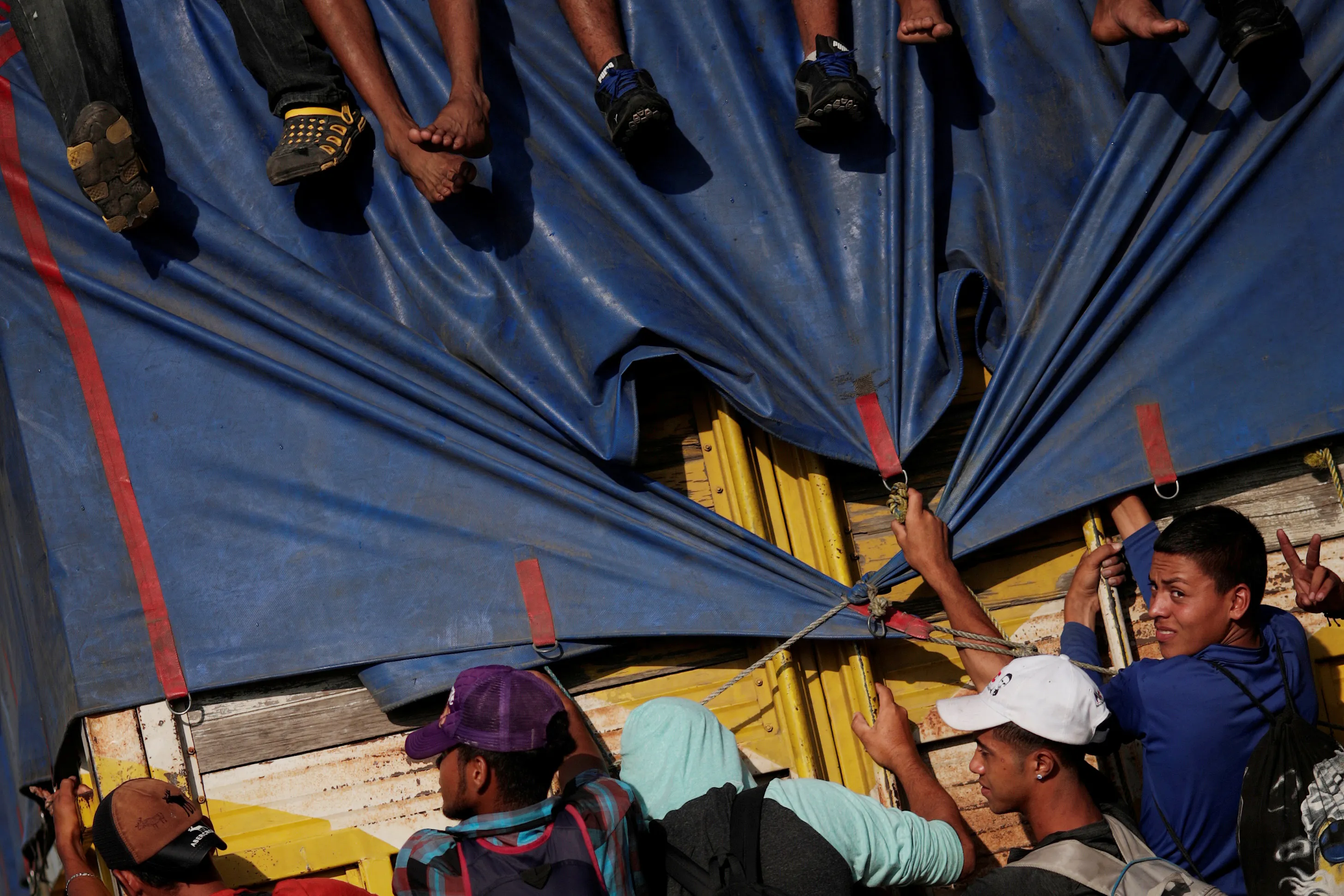 Migrants, part of a caravan of thousands from Central America en route to the United States, hitchhike on a truck along the highway to Santiago Niltepec from San Pedro Tapanatepec, Mexico, October 29, 2018. (Photo by Ueslei Marcelino/Reuters)