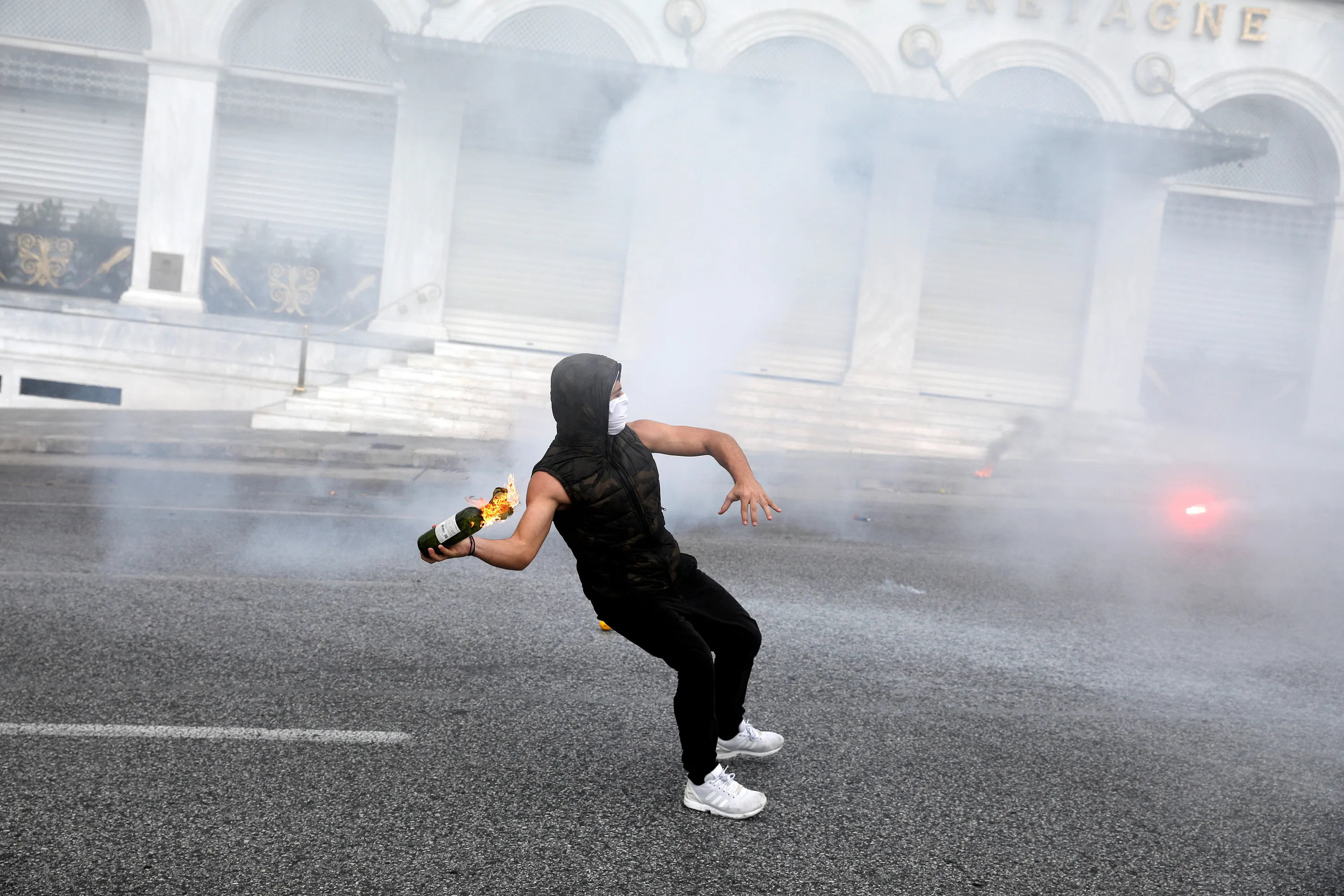 A hooded youth prepares to throw a petrol bomb during clashes with riot police as Greek students demonstrate against a draft bill changing university entrance requirements in Athens, Greece, October 29, 2018. (Photo by Alkis Konstantinidis/Reuters)