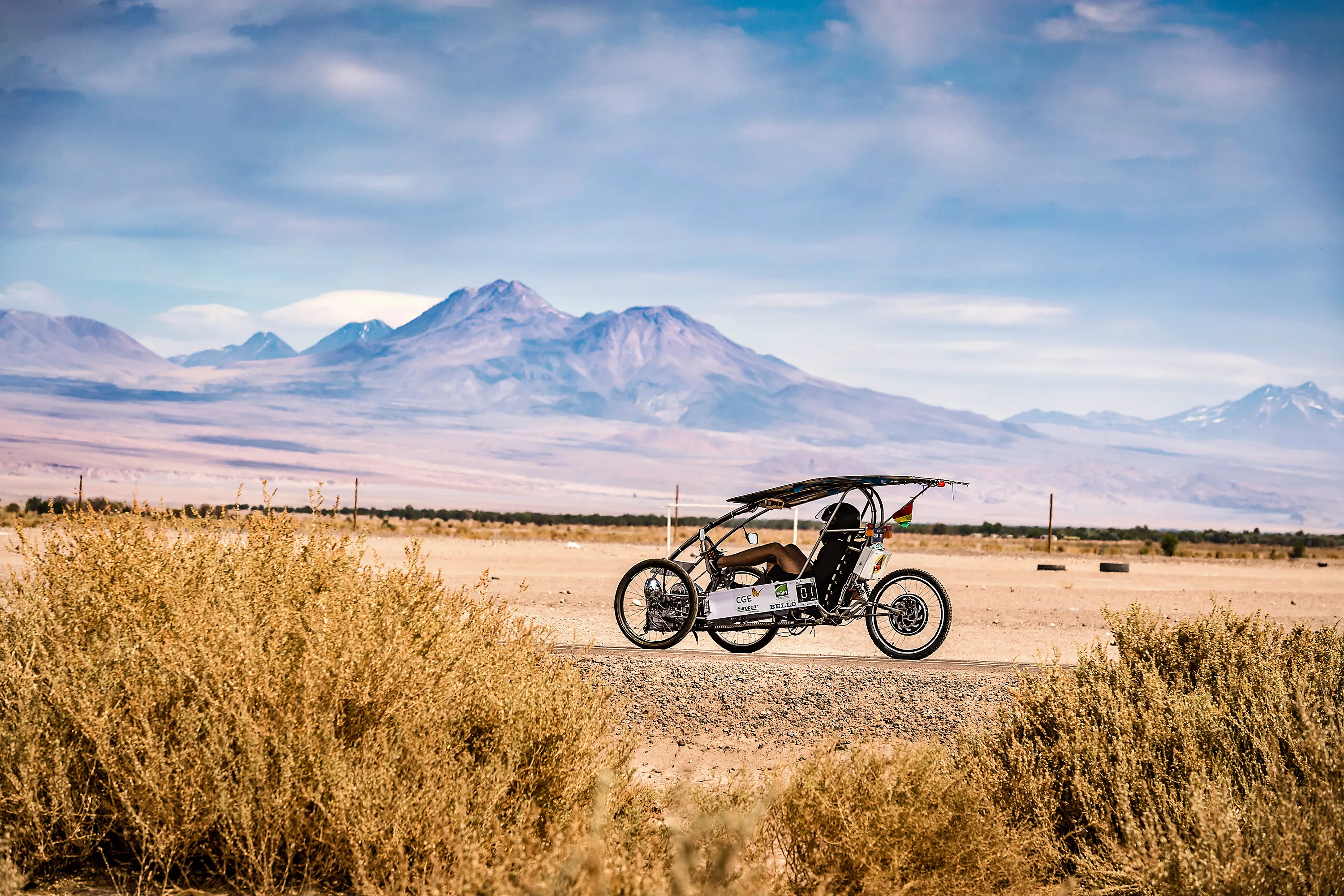 In this photo taken on Tuesday, October 23, 2018, the Equipo Bolivia Hybrid car from Bolivia competes during the Carrera Solar Atacama solar race in San Pedro de Atacama, Chile. The 5th Carrera Solar Atacama will stretch from Santiago through the north of Chile to Arica. The race takes place in the driest desert in the world, where you can find the highest levels of solar radiation on the planet. (Photo by Geert Vanden Wijngaert/AP Photo)