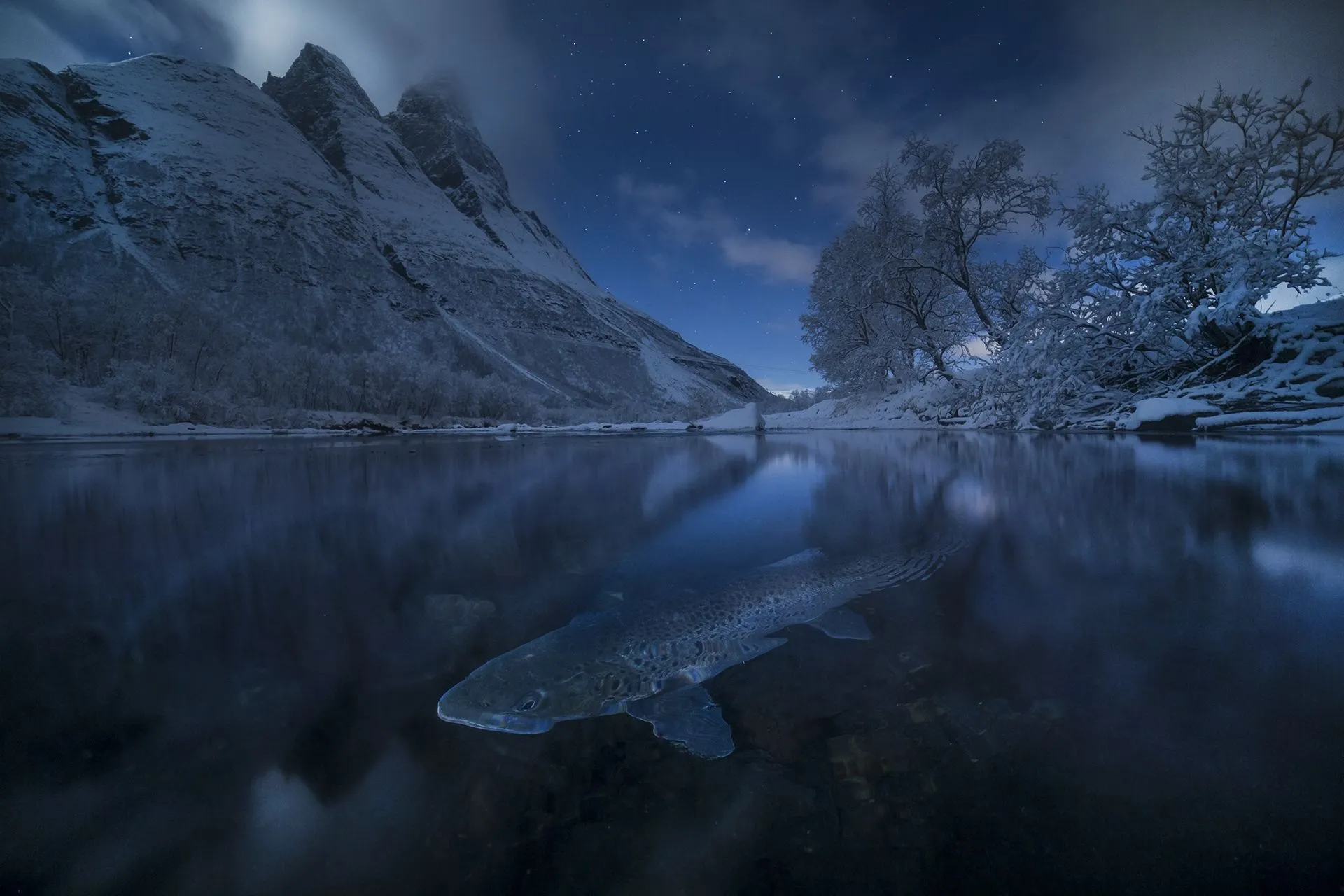 Polar Trout, Norway, by Audun Rikardsen. At Signaldalen, northern Norway, a brown trout is captured spawning under the stars on a moonlit night. Honourable mention, the Beauty of Nature category. (Photo by Audun Rikardsen/SIPA Contest)