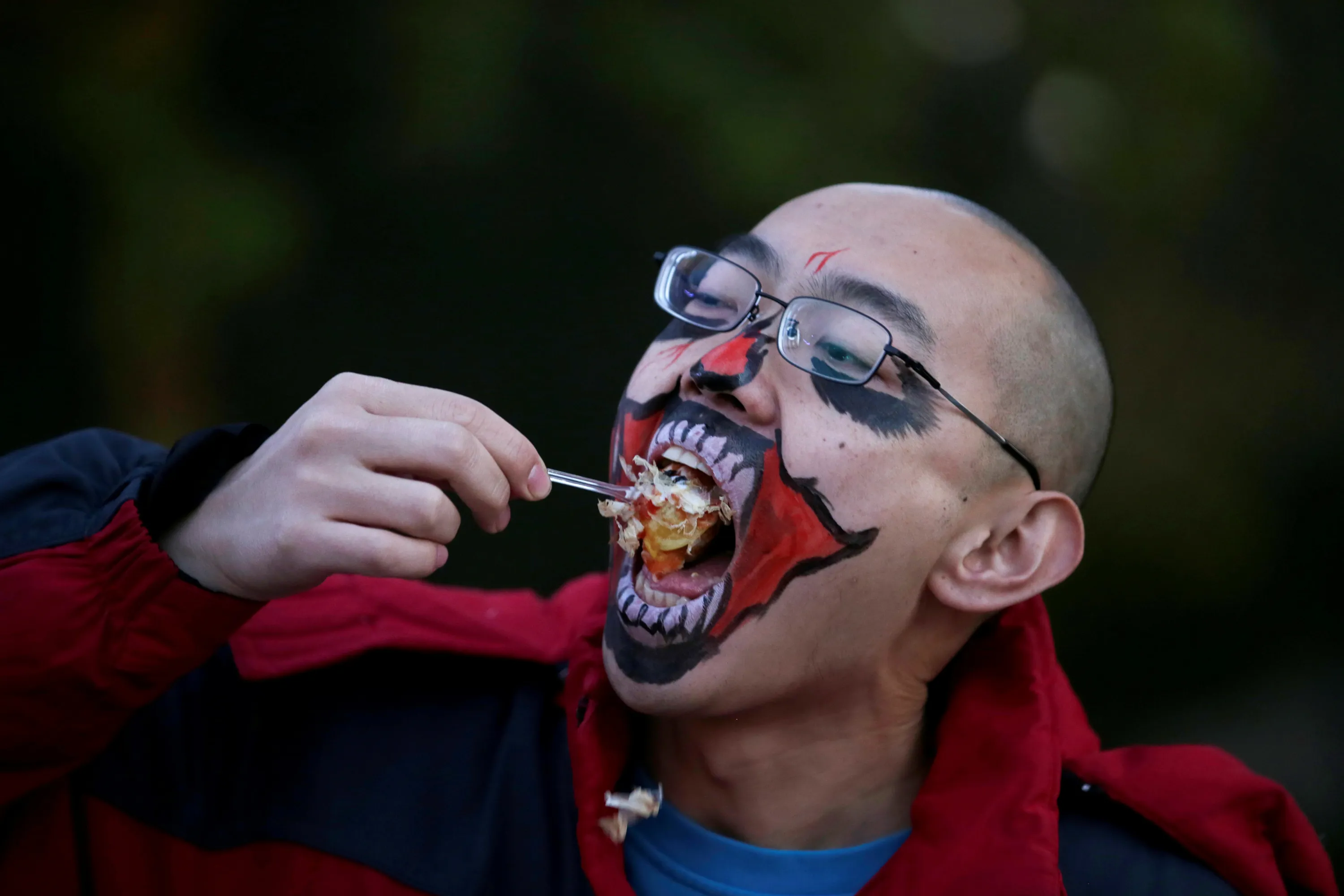 A participant in costume eats before a Halloween event at Happy Valley park in Beijing, China, October 31, 2018. (Photo by Jason Lee/Reuters)