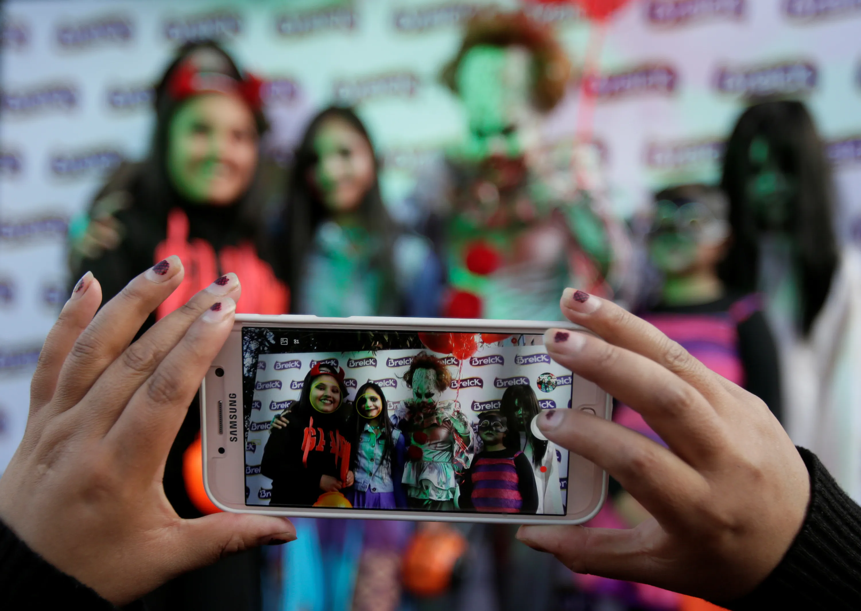 A woman takes a picture of people in costume during Halloween celebrations in La Paz, Bolivia on October 31, 2018. (Photo by David Mercado/Reuters)