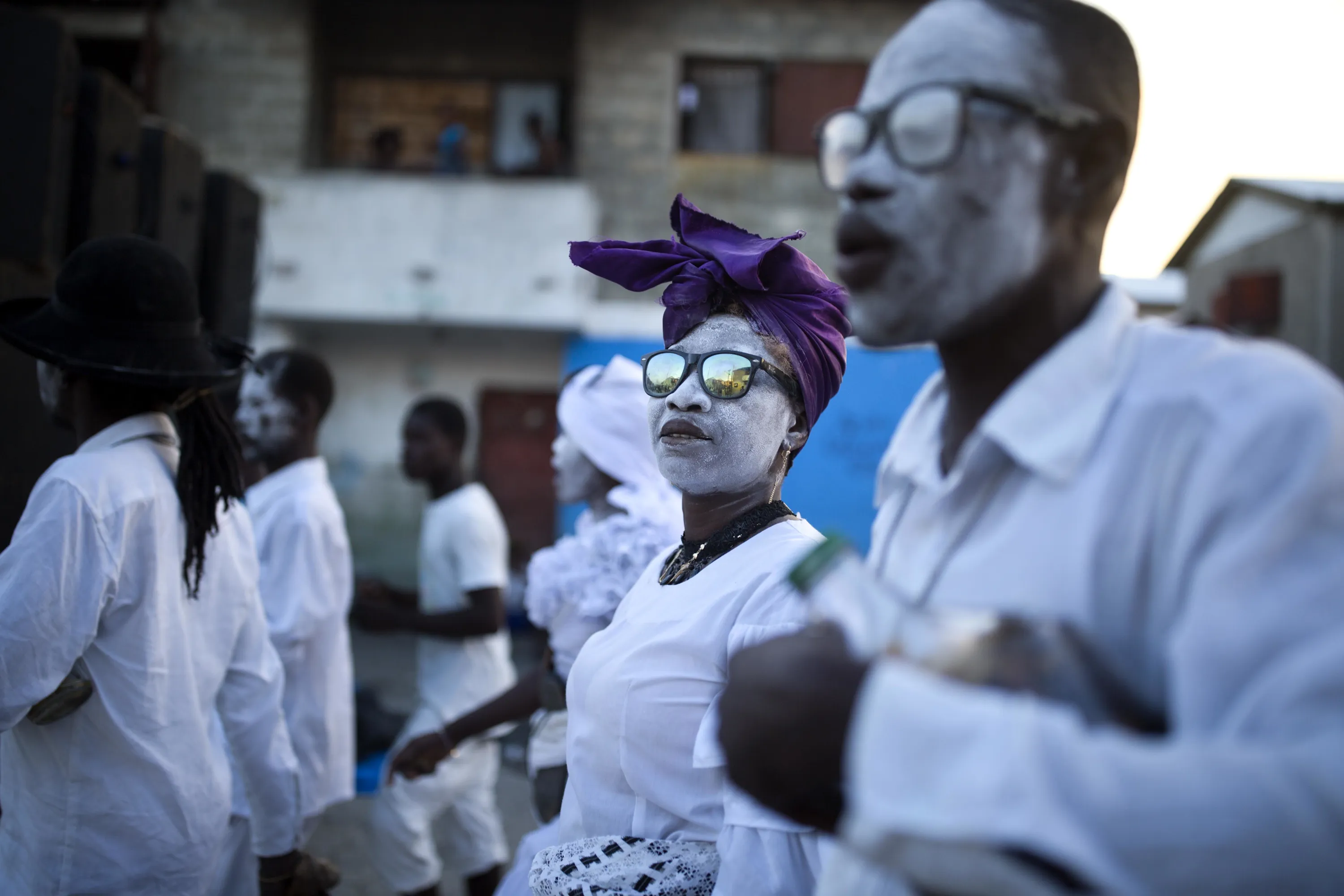 In this November 1, 2018 photo, voodoo believers who are supposed to be possessed with Gede spirit walk in the middle of the street during the annual Voodoo festival Fete Gede at Cite Soleil Cemetery in Port-au-Prince, Haiti. Every year, during the celebration, they paint their faces with white powder, wear the loas' clothes, travel the narrowly pathways through the shanty town and go to cemeteries to pay tribute to the spirits. (Photo by Dieu Nalio Chery/AP Photo)