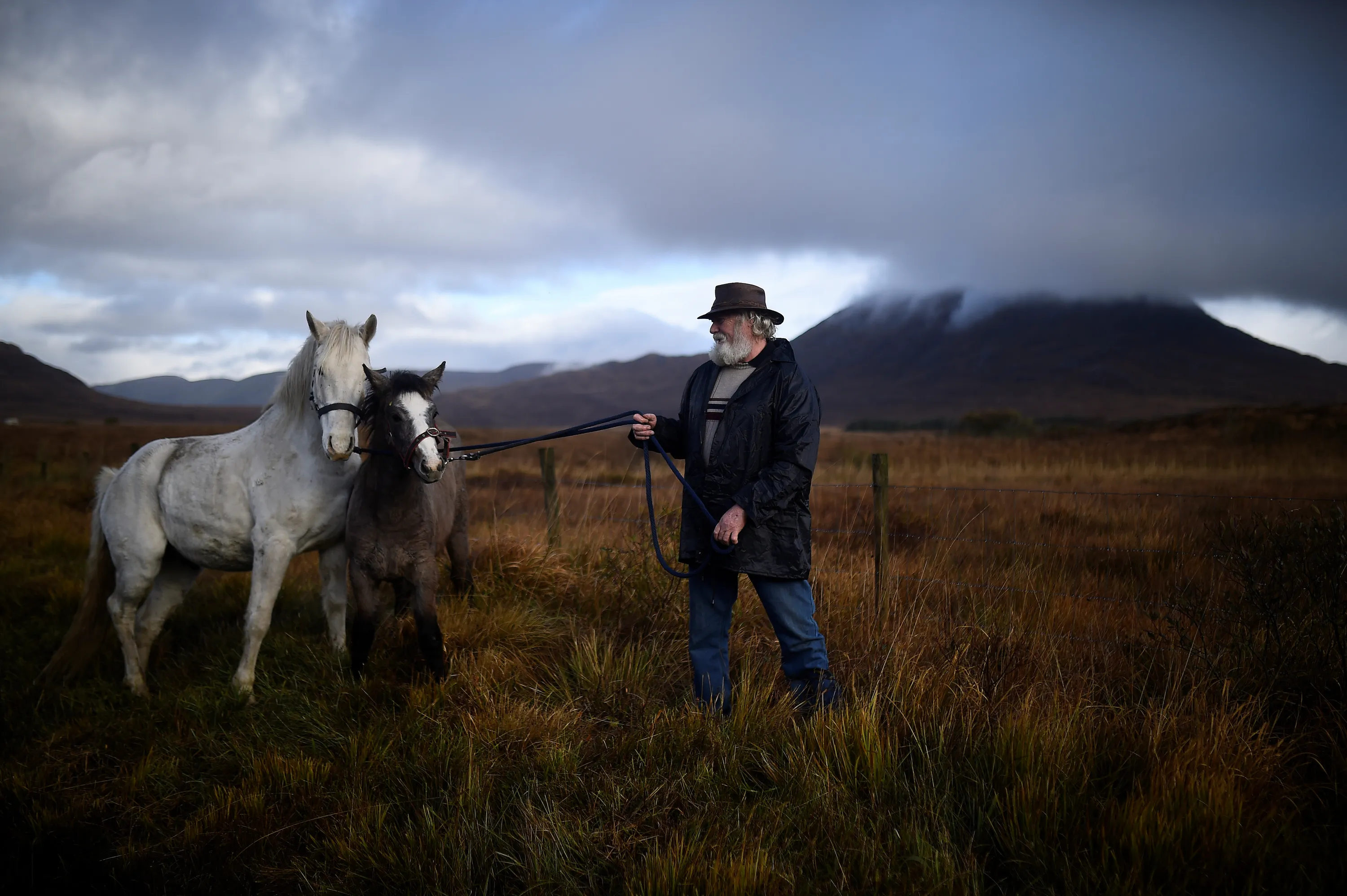 Henry Judge from Sligo holds Connemara ponies he is selling at the annual Maam Cross fair in the Connemara region of Maam Cross in Galway, Ireland, October 30, 2018. (Photo by Clodagh Kilcoyne/Reuters)