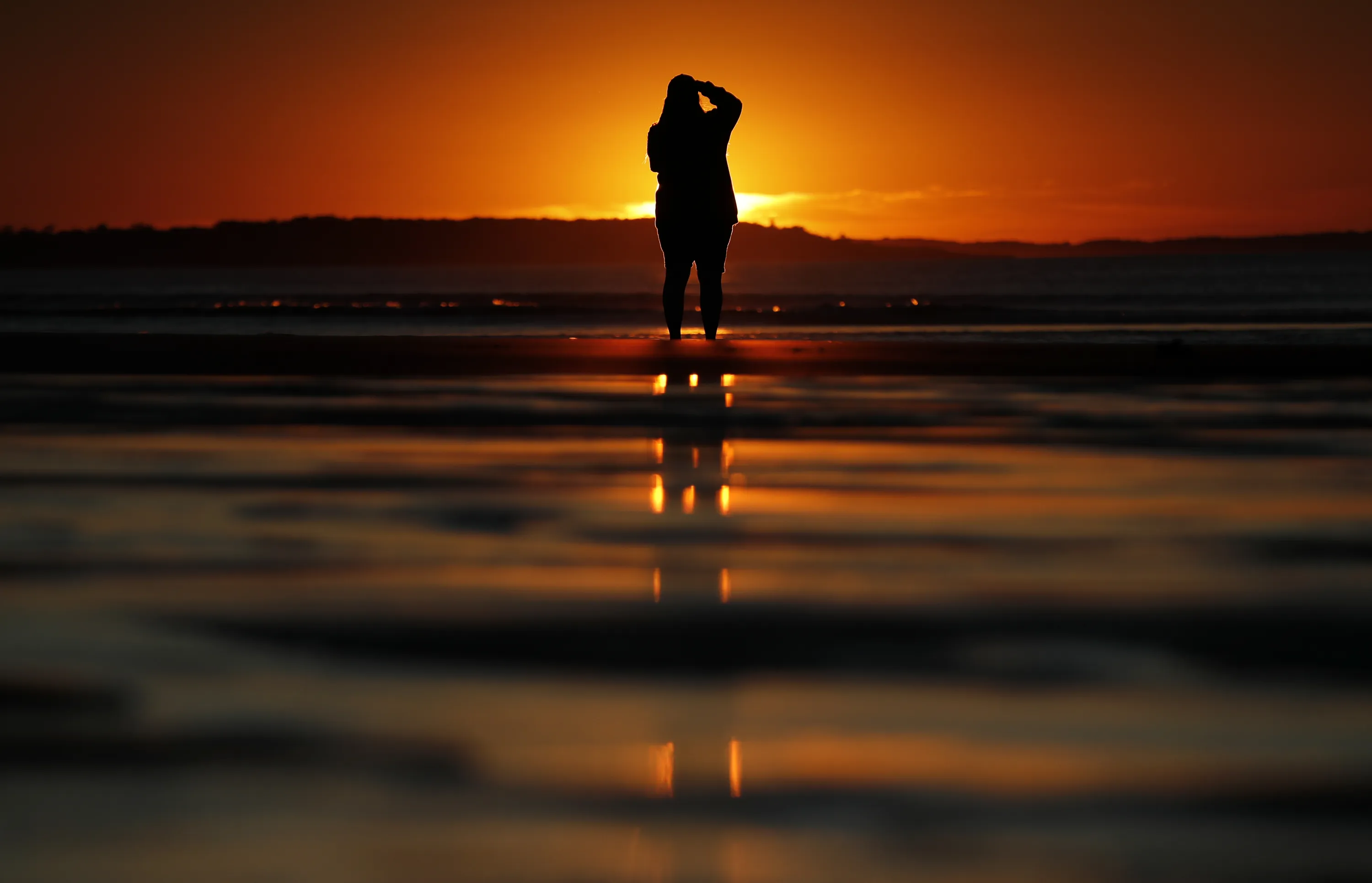 Consuello Jessop, of Providence, R.I., photographs the sunrise at Ocean Park, Thursday, July 12, 2018, in Old Orchard Beach, Maine. Sunny skies with comfortable temperatures and low relative humidity should make for ideal beach conditions today and Friday. (Photo by Robert F. Bukaty/AP Photo)