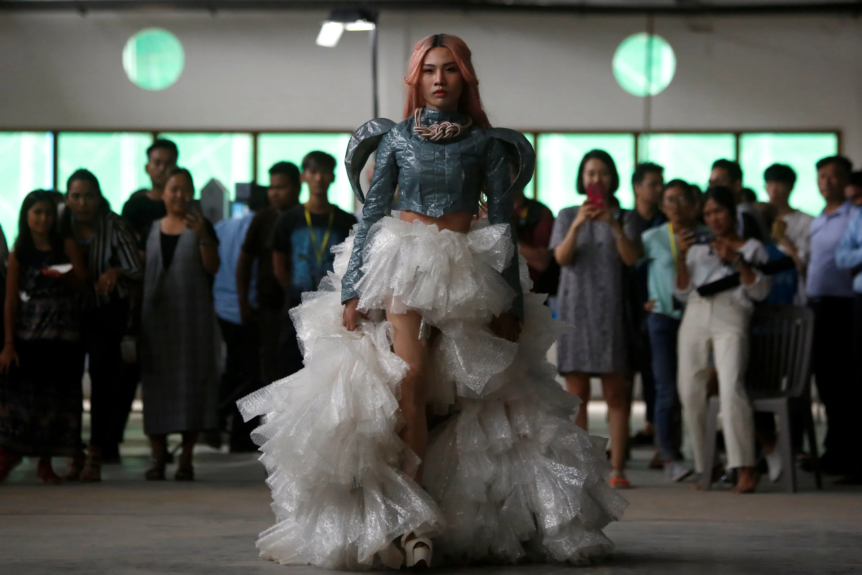 A model wears a dress made out of recycled material during a show organised by LGBT fashion designers to battles discrimination in Phnom Penh, Cambodia, October 24, 2018. (Photo by Samrang Pring/Reuters)