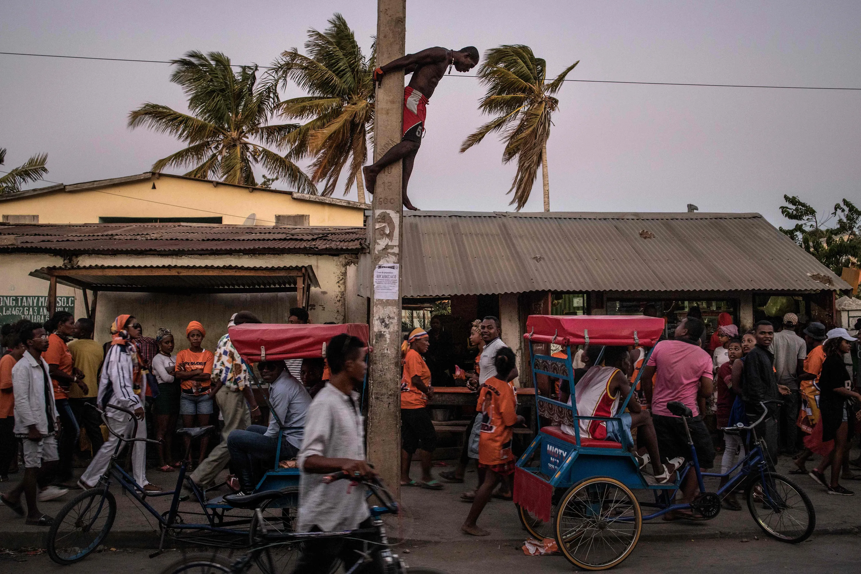 A man dangles from an electricity pole as he watches supporters of Madagascar presidential candidate Andry Rajoelina, streaming towards a rally in Tulear, on November 4, 2018. Former President Marc Ravalomanana and rival Andry Rajoelina are frontrunners in the November 7 ballot in Madagascar, where protests earlier this year erupted over a government attempt to reform electoral rules. After months of tension, the Constitutional Court ordered a caretaker government to organise the ballot. If none of the candidates gets more than 50 percent of the votes cast, a second round will be held on December 19. (Photo by Marco Longari/AFP Photo)
