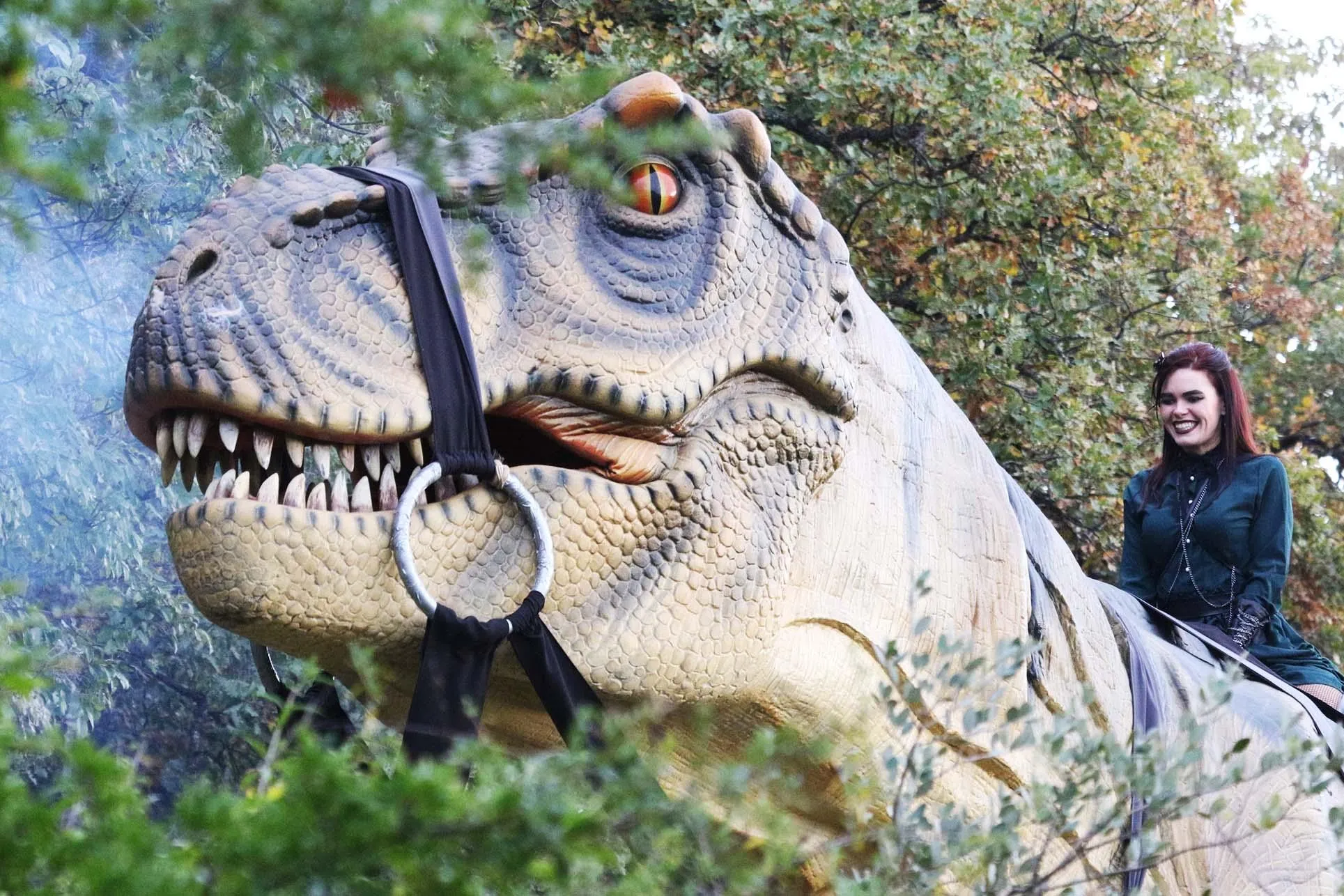 A cosplayer sits on a life-size model of a dinosaur during an exhibition at the Nikitsky Botanical Garden outside Yalta, Crimea on November 10, 2018. (Photo by Pavel Rebrov/Reuters)