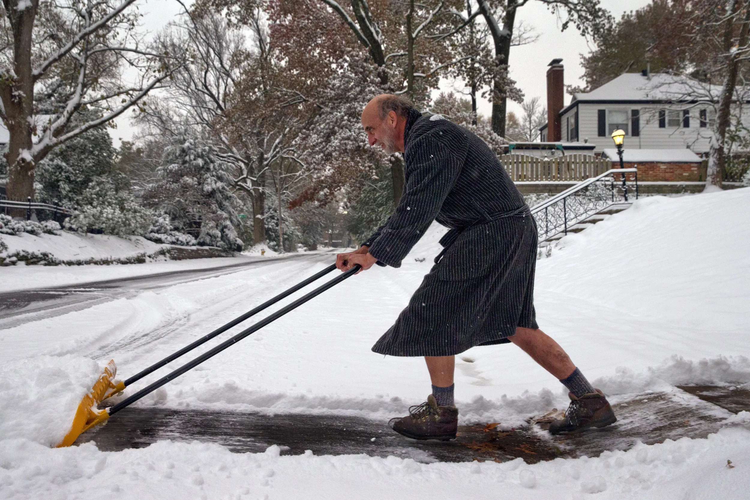 Richard Burst clears snow from his driveway Thursday, November 15, 2018 in St. Louis. “All I really need to accomplish are two lanes for my car”, he said. Much of the region had at least 4 inches of snow and forecasters expect about 1 inch or 2 inches more will fall by the time it tapers off around noon Thursday. (Photo by Robert Cohen /St. Louis Post-Dispatch via AP Photo)