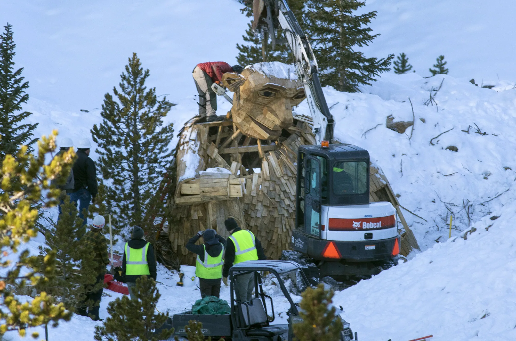 Thursday morning, November 15, 2018, the Town of Breckenridge employees beheads “Isak Hearthstone”, a wooden troll built by artist Thomas Dambo, by a chainsaw to remove it entirely from the Wellington Trail, in Breckenridge, Colo. The troll was created during the Breckenridge Festival of the Arts in August, but got so popular that it caused complaints from nearby homeowners due to tourists visiting, and demanded it to be removed. (Photo by Hugh Carey/Summit Daily News via AP Photo)