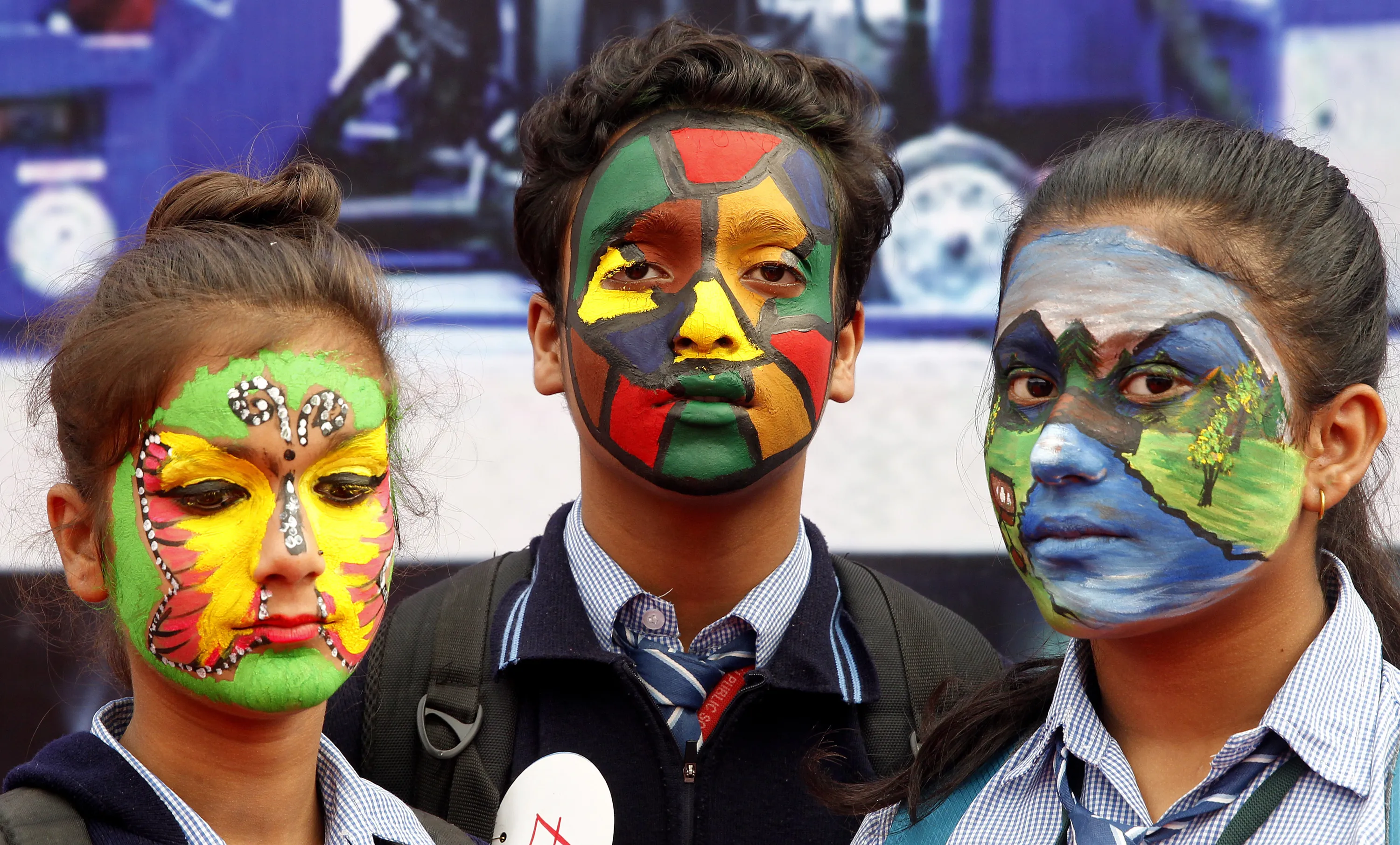 Indian school children stand with their face painted to promote the Clean Indian Movement, or Swachh Bharat Mission, as they participate in an event held to mark World Toilet Day, in New Delhi, India, 19 November 2018. November 19 has been designated as World Toilet Day by the United Nations, to draw attention to the issue of sanitation and to create awareness about the importance of toilets. The event was organised by the India-based social service organization Sulabh International that works to promote environmental sanitation. (Photo by Harish Tyagi/EPA/EFE)