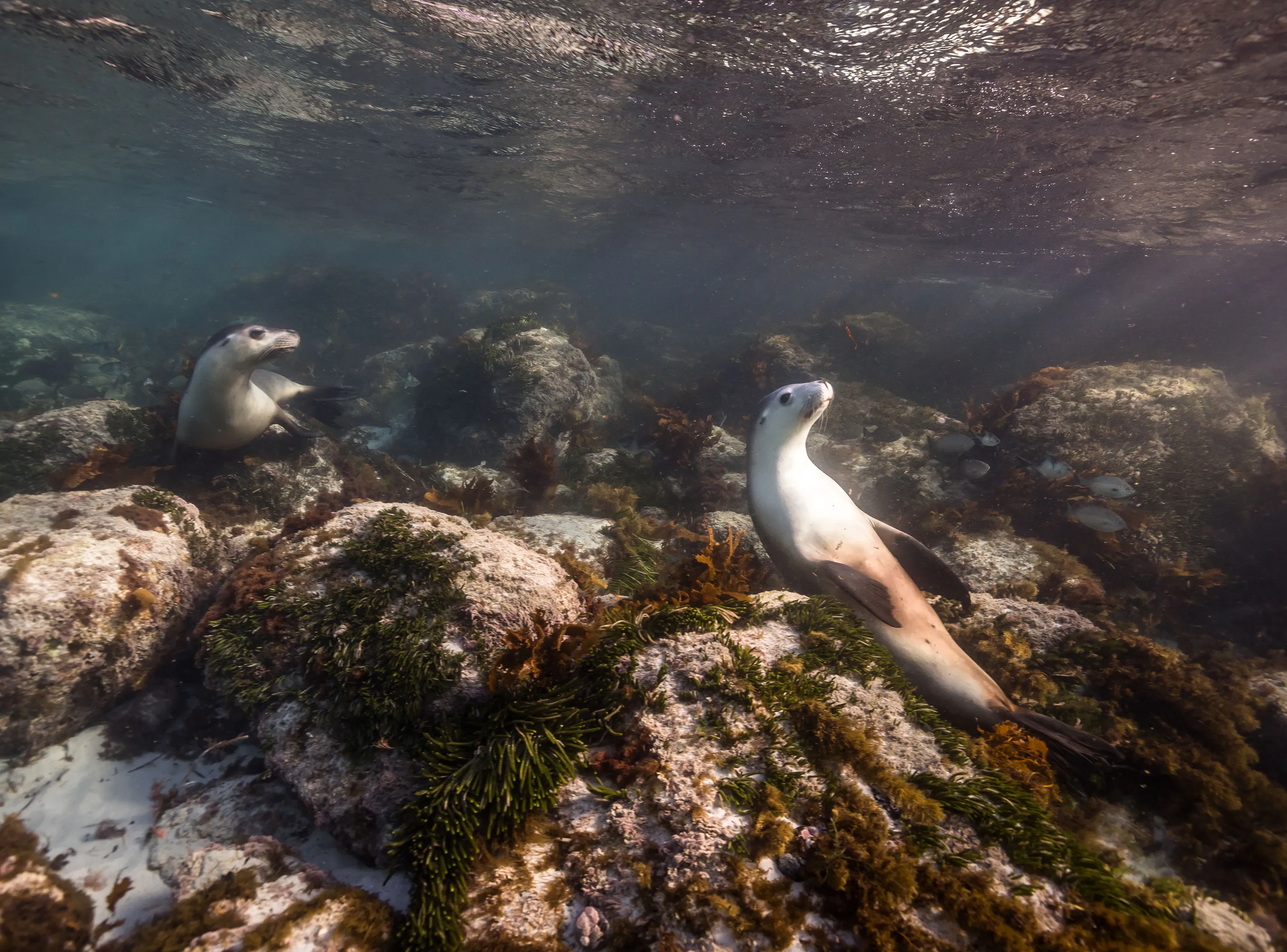 Australian sea lions warming themselves in the shallows. (Photo by Philip Hamilton/The Guardian)