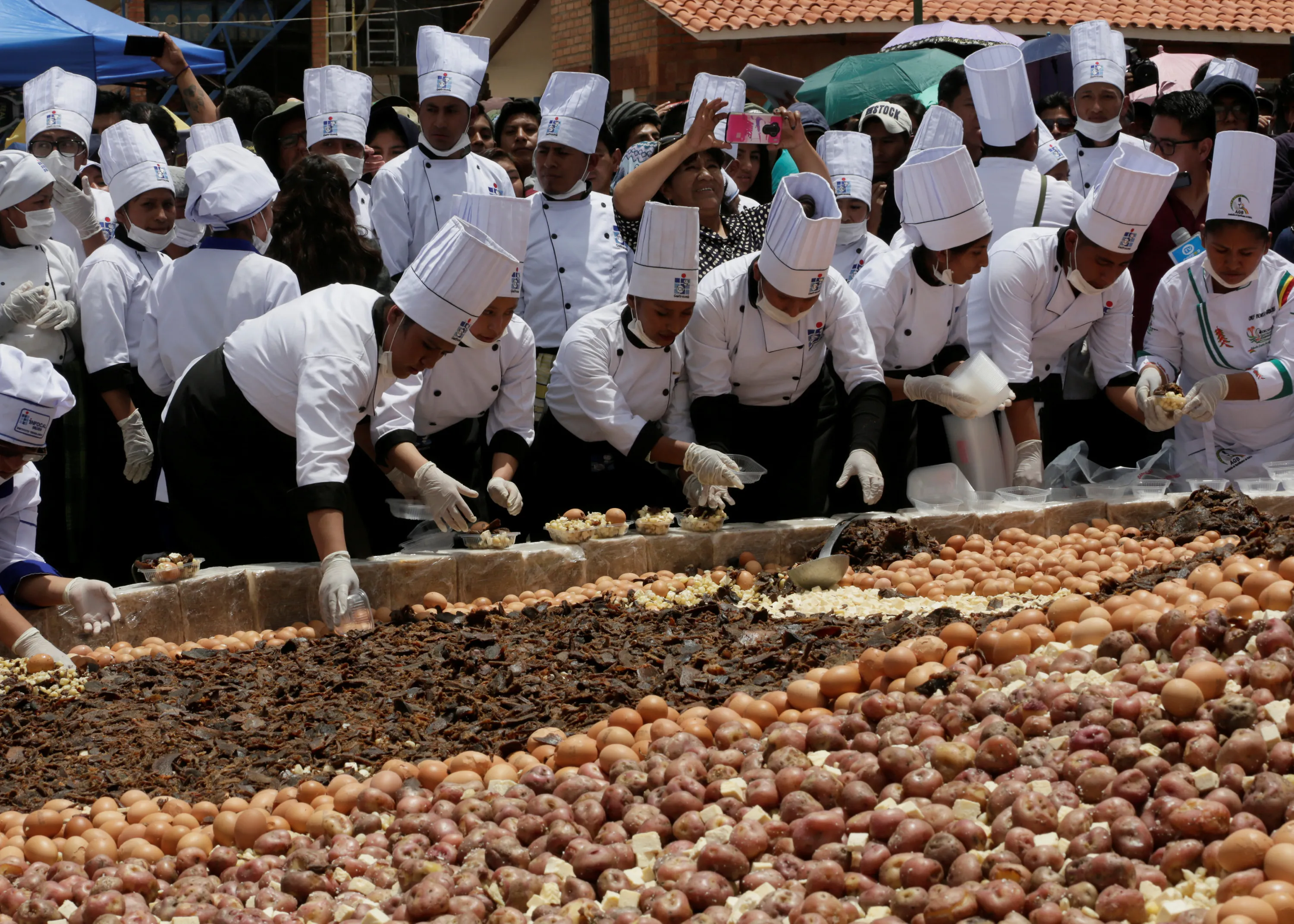 Cooks prepare a stew called Charquekan, made with llama meat, potatoes, eggs and cheese, during the inauguration ceremony at the World's Camelids Convention in Oruro, Bolivia, November 21, 2018. (Photo by David Mercado/Reuters)