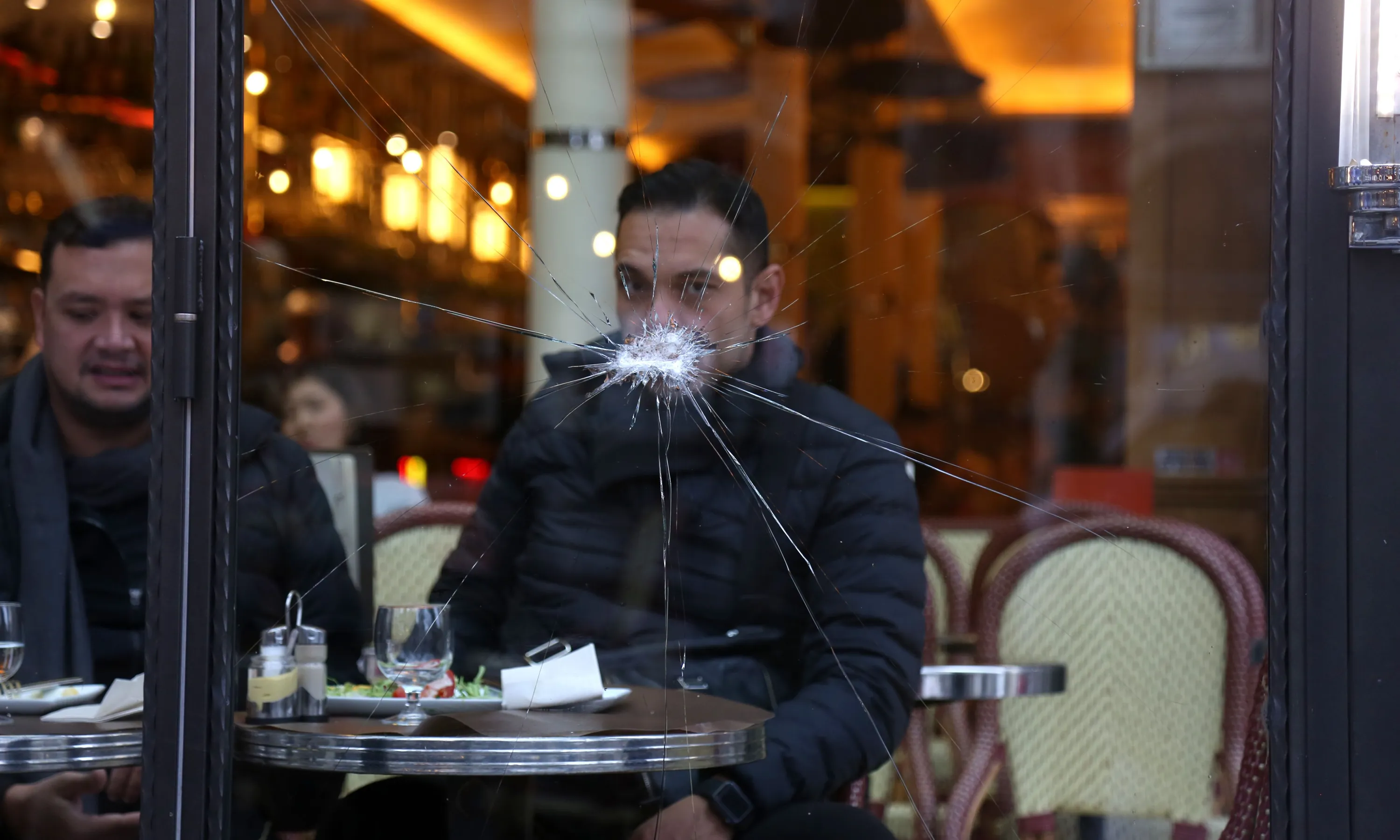 Men sit in a bar behind a damaged window on the Champs- Elysees avenue in Paris on November 25, 2018 after a rally by yellow vest (Gilets jaunes) protestors against rising oil prices and living costs. Security forces in Paris fired tear gas and water cannon on November 24 to disperse protesters. Several thousand demonstrators, wearing high- visibility yellow jackets, had gathered on the avenue as part of protests which began on November 17, 2018. (Photo by Zakaria Abdelkafi/AFP Photo)
