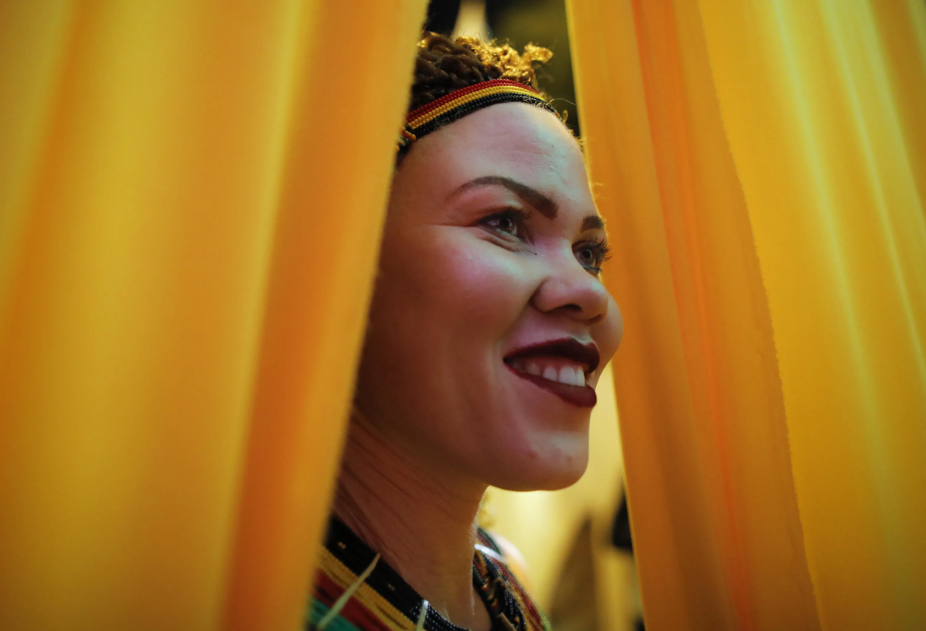 An albino woman looks through the curtain as she prepares for the fashion show during the Mr. & Miss Albinism East Africa contest in Nairobi, Kenya, 30 November 2018. (Photo by Dai Kurokawa/EPA/EFE)
