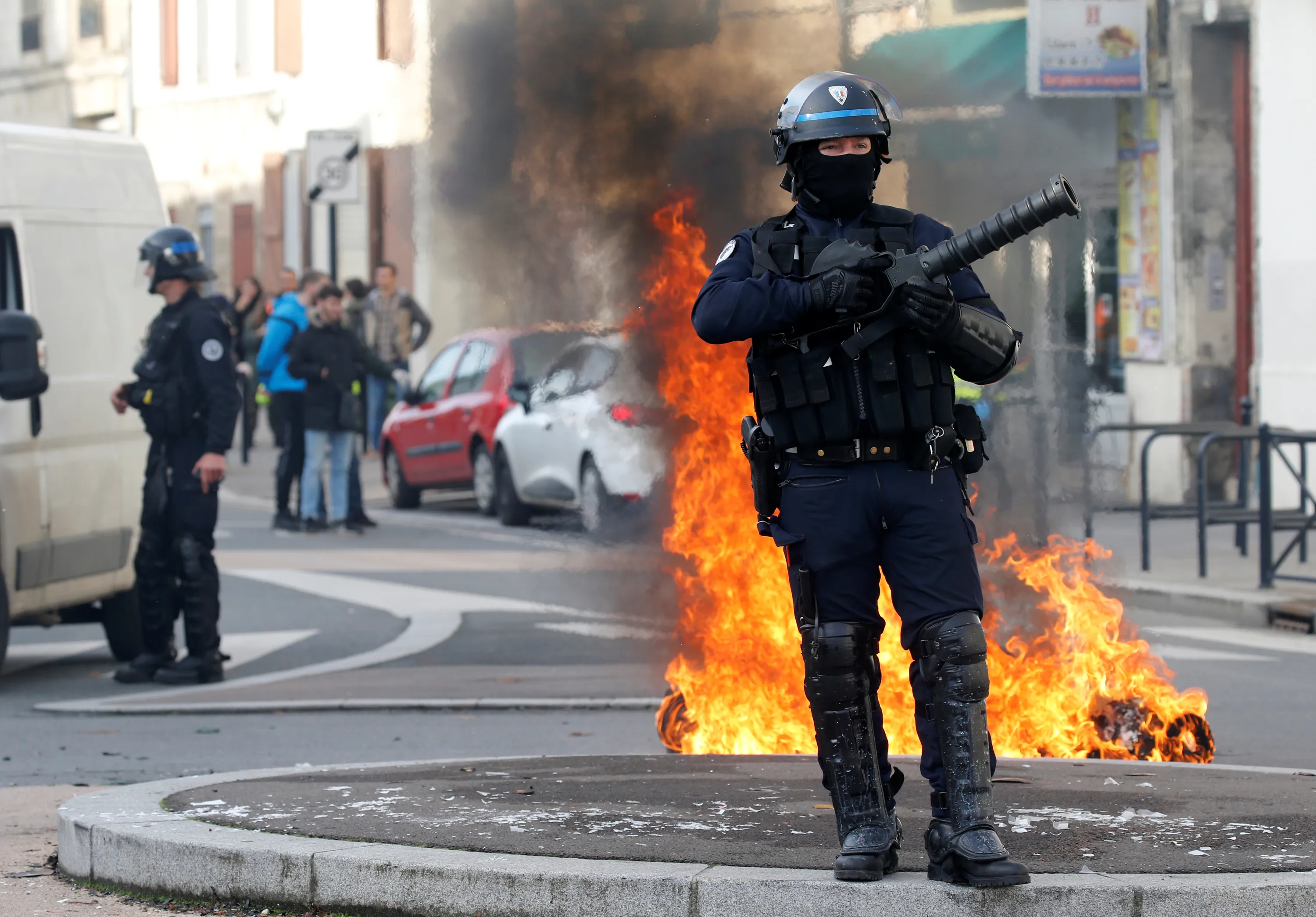 A French riot policeman stands next to a burning trash container as youth and students protest against reform plan in the streets of Bordeaux, France on December 5, 2018. (Photo by Regis Duvignau/Reuters)