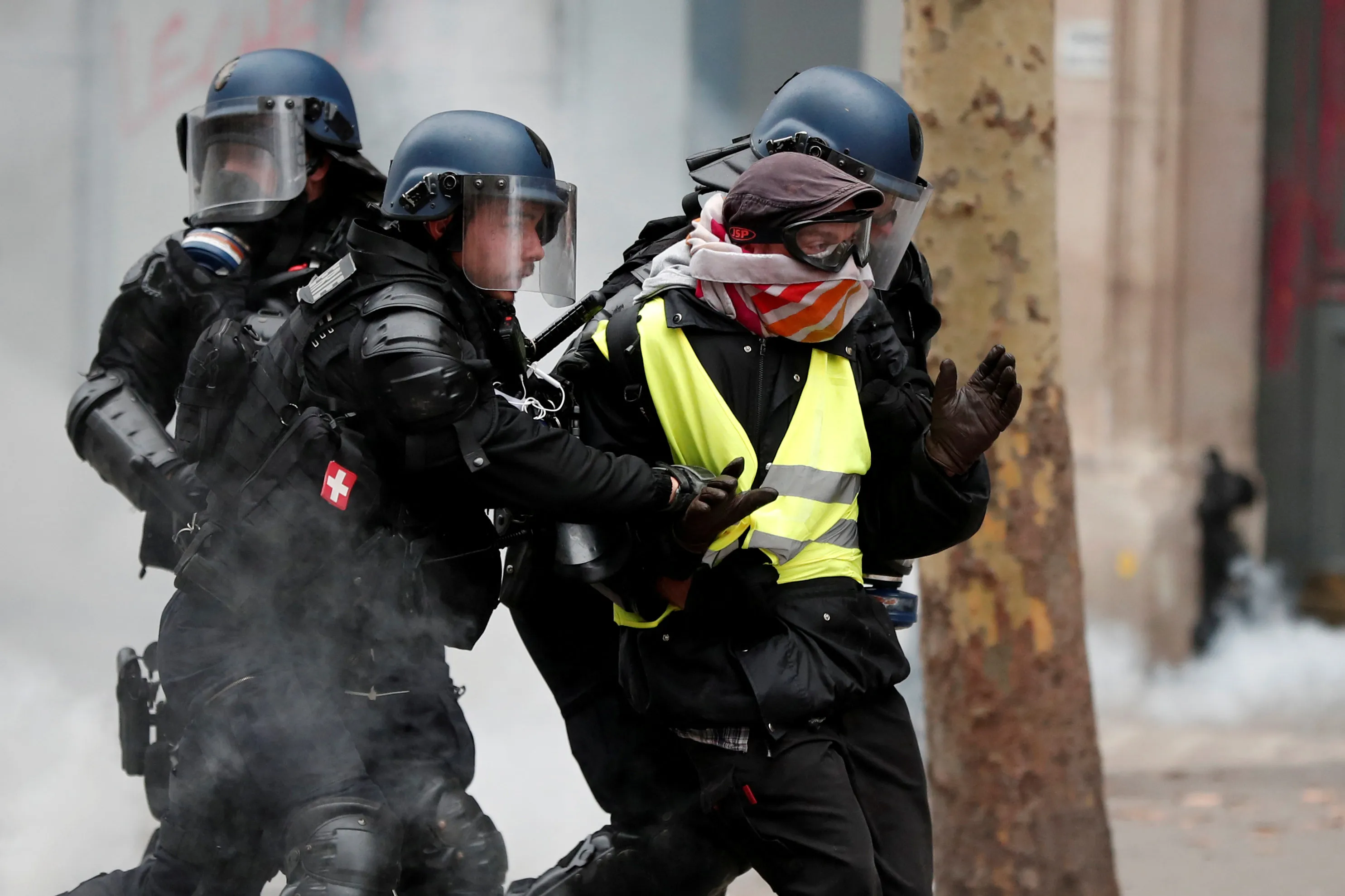 French gendarmes apprehend a protester during clashes at a demonstration by the “yellow vests” movement in Paris, France, December 8, 2018. (Photo by Benoit Tessier/Reuters)