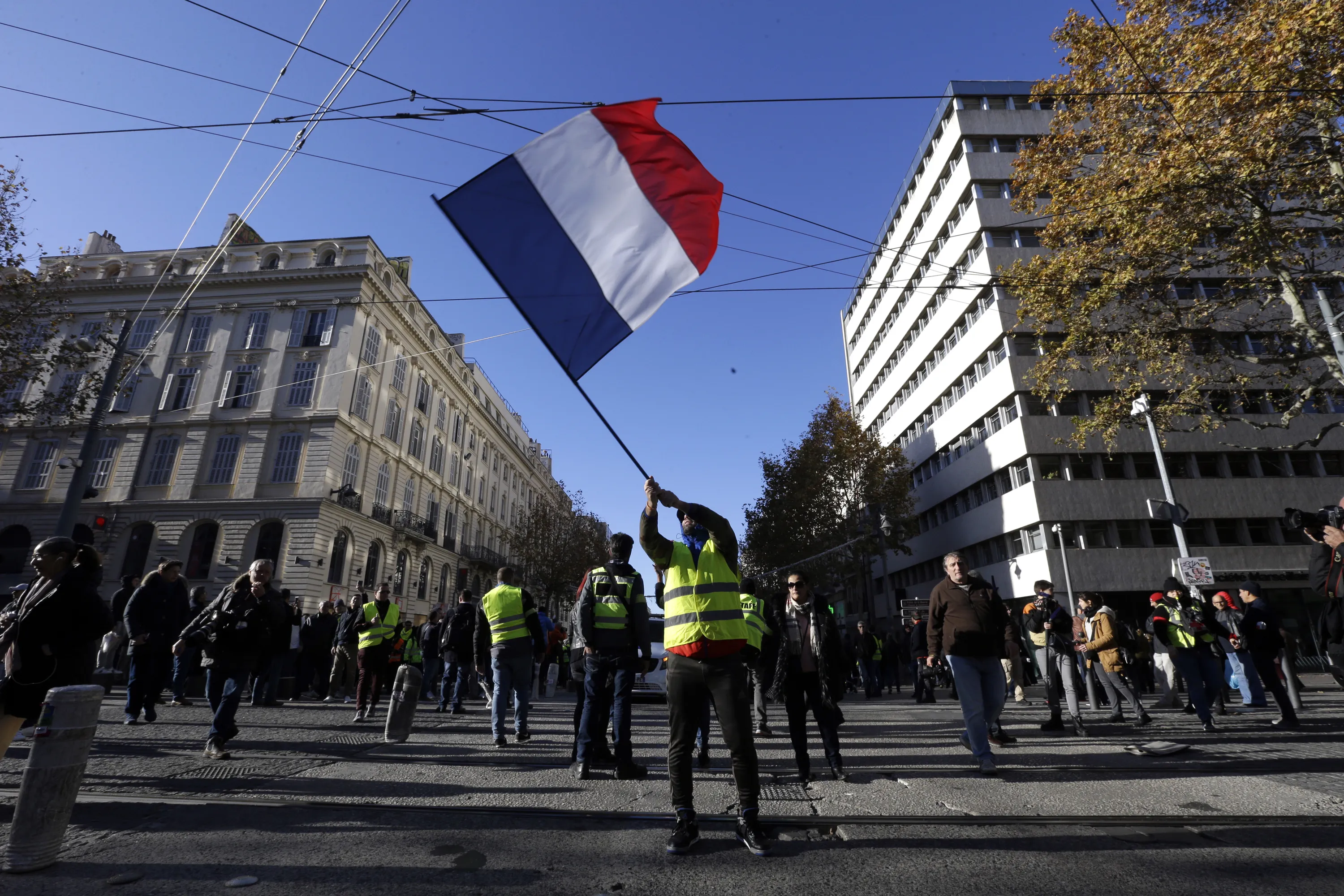 A demonstrator wearing a yellow vest waves the French flag during a march Saturday, December 8, 2018 in Marseille, southern France. The grassroots movement began as resistance against a rise in taxes for diesel and gasoline, but quickly expanded to encompass frustration at stagnant incomes and the growing cost of living. (Photo by Claude Paris/AP Photo)