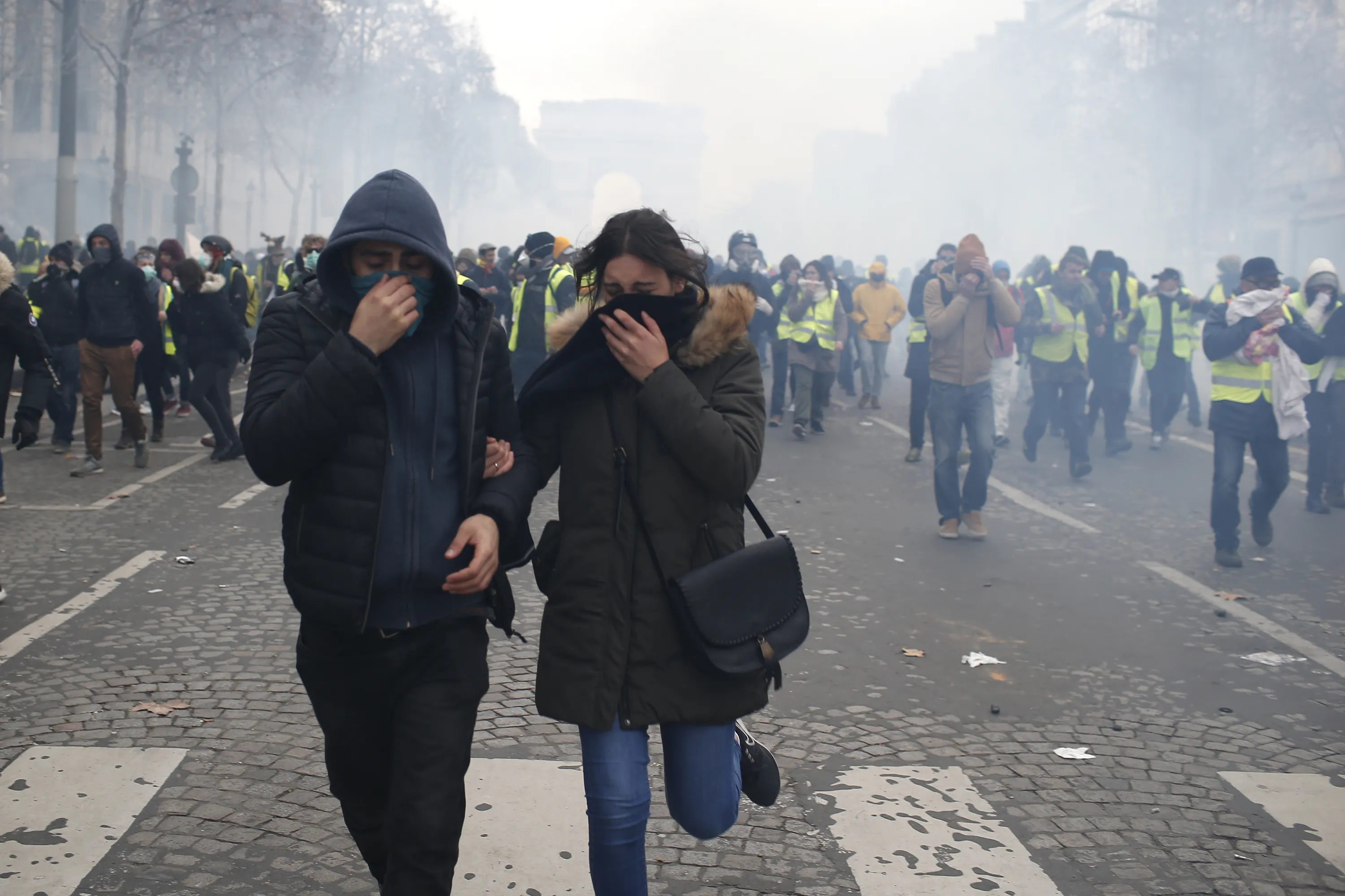 Demonstrators run away amid tear gas on the Champs-Elysees avenue Saturday, December 8, 2018 in Paris. (Photo by Rafael Yaghobzadeh/AP Photo)