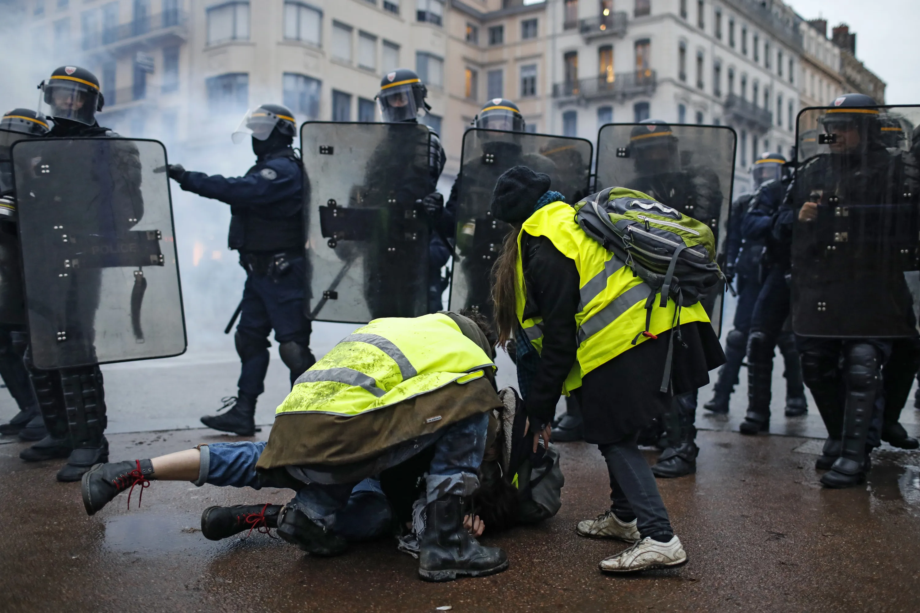 Police officers clash with demonstrators in Lyon, central France, Saturday, December 8, 2018. The grassroots movement began as resistance against a rise in taxes for diesel and gasoline, but quickly expanded to encompass frustration at stagnant incomes and the growing cost of living. (Photo by Laurent Cipriani/AP Photo)