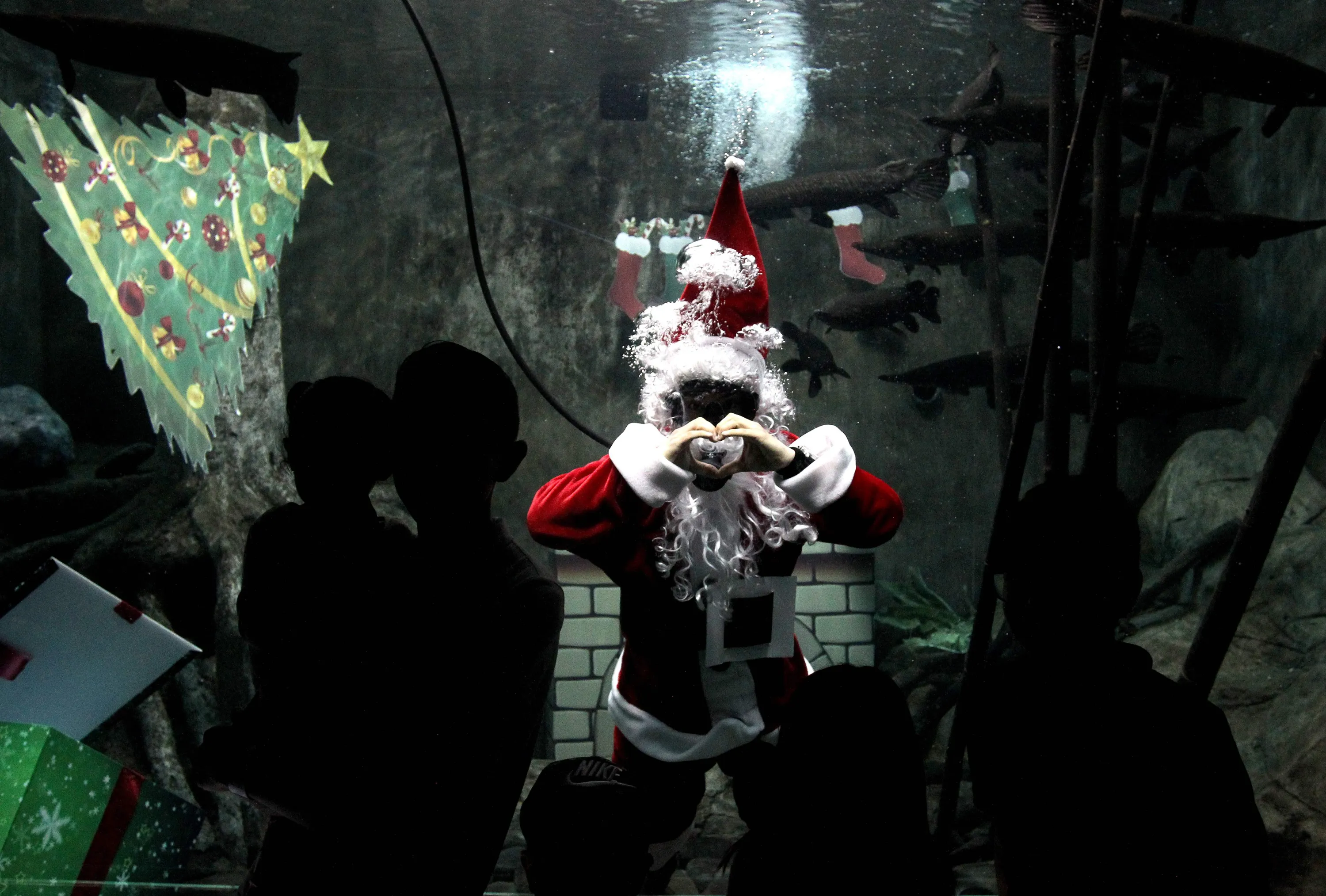 Biologist Octavio Nuno disguised as Santa Claus swims in a pool with Catan fish (Lepisosteus osseus), at the Guadalajara zoo's aquarium, in Guadalajara, Mexico, on December 8, 2018. The zoo offers the show during the Christmas season. (Photo by Ulises Ruiz/AFP Photo)
