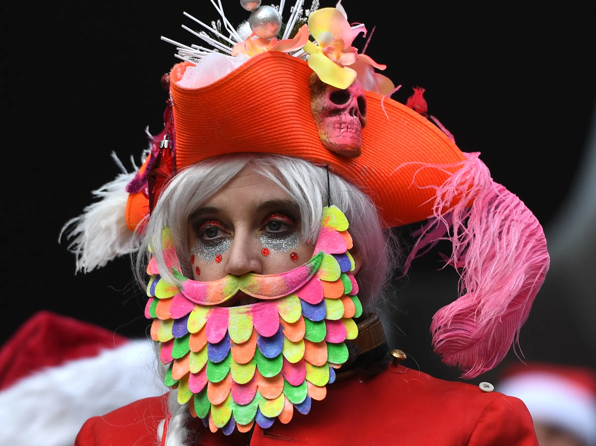 Revelers dressed as Santa Claus or in festive costumes arrive for the start of SantaCon 2018 in New York City December 8, 2018. (Photo by Timothy A. Clary/AFP Photo)