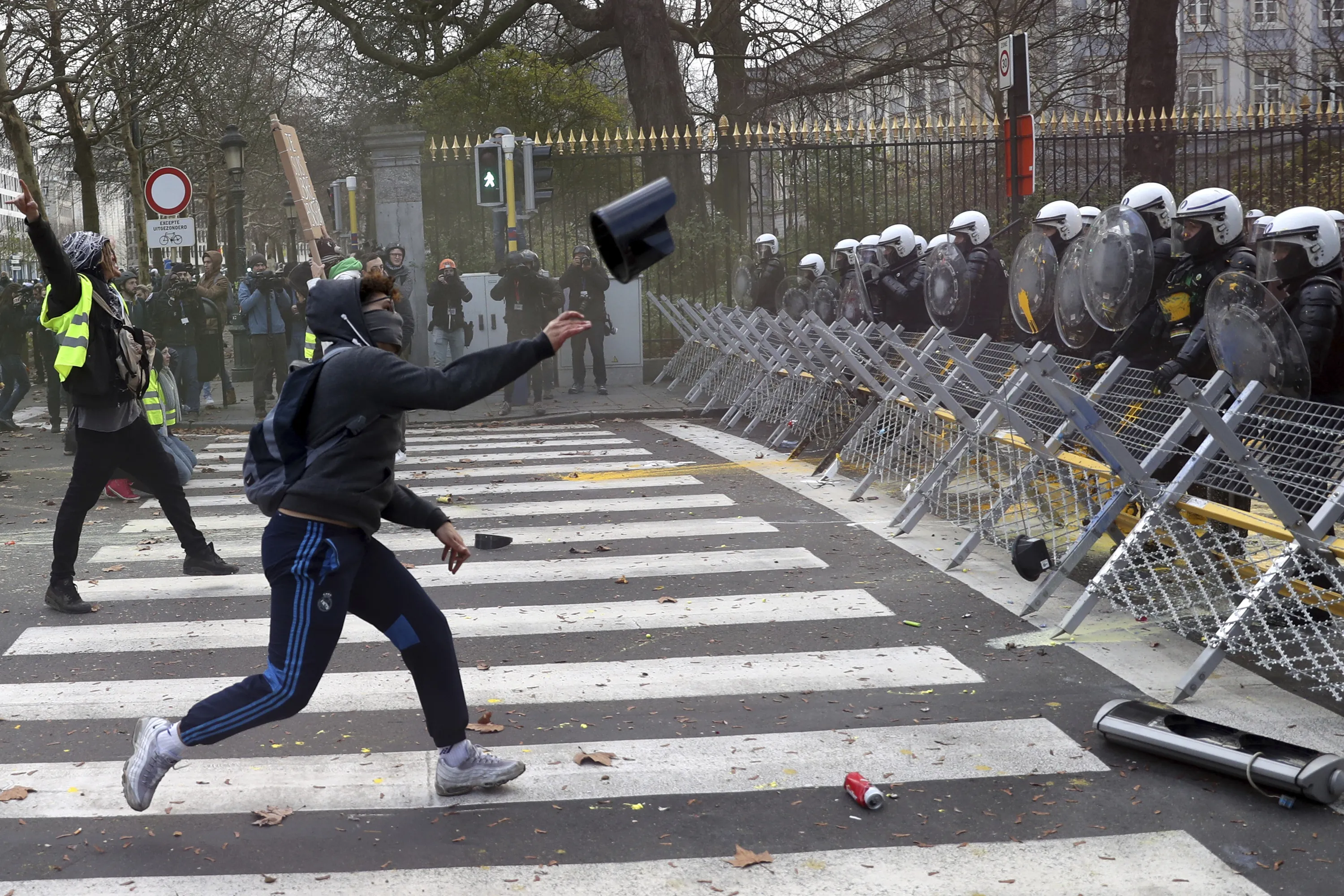 A protestor throws an object at a police line during a demonstration in Brussels, Saturday, December 8, 2018. Hundreds of police officers are being mobilized in Brussels Saturday, where yellow vest protesters last week clashed with police and torched two police vehicles. More than 70 people were detained. (Photo by Francisco Seco/AP Photo)