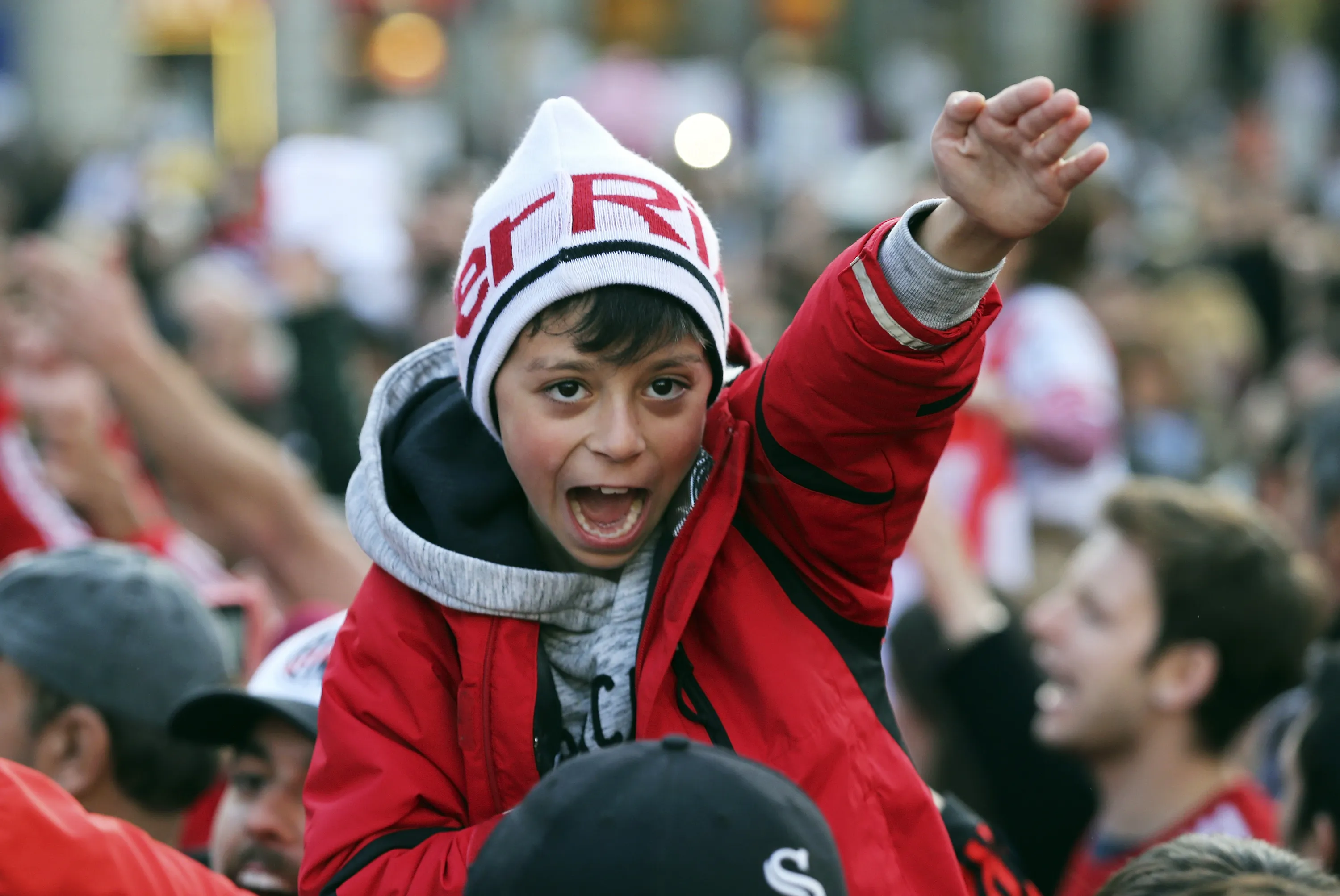 River Plate supporters cheer during a gathering at the Puerta del Sol square in Madrid Saturday, December 8, 2018. The Copa Libertadores Final between River Plate and Boca Juniors will be played on Dec. 9 in Madrid, Spain, at Real Madrid's stadium. (Photo by Armando Franca/AP Photo)