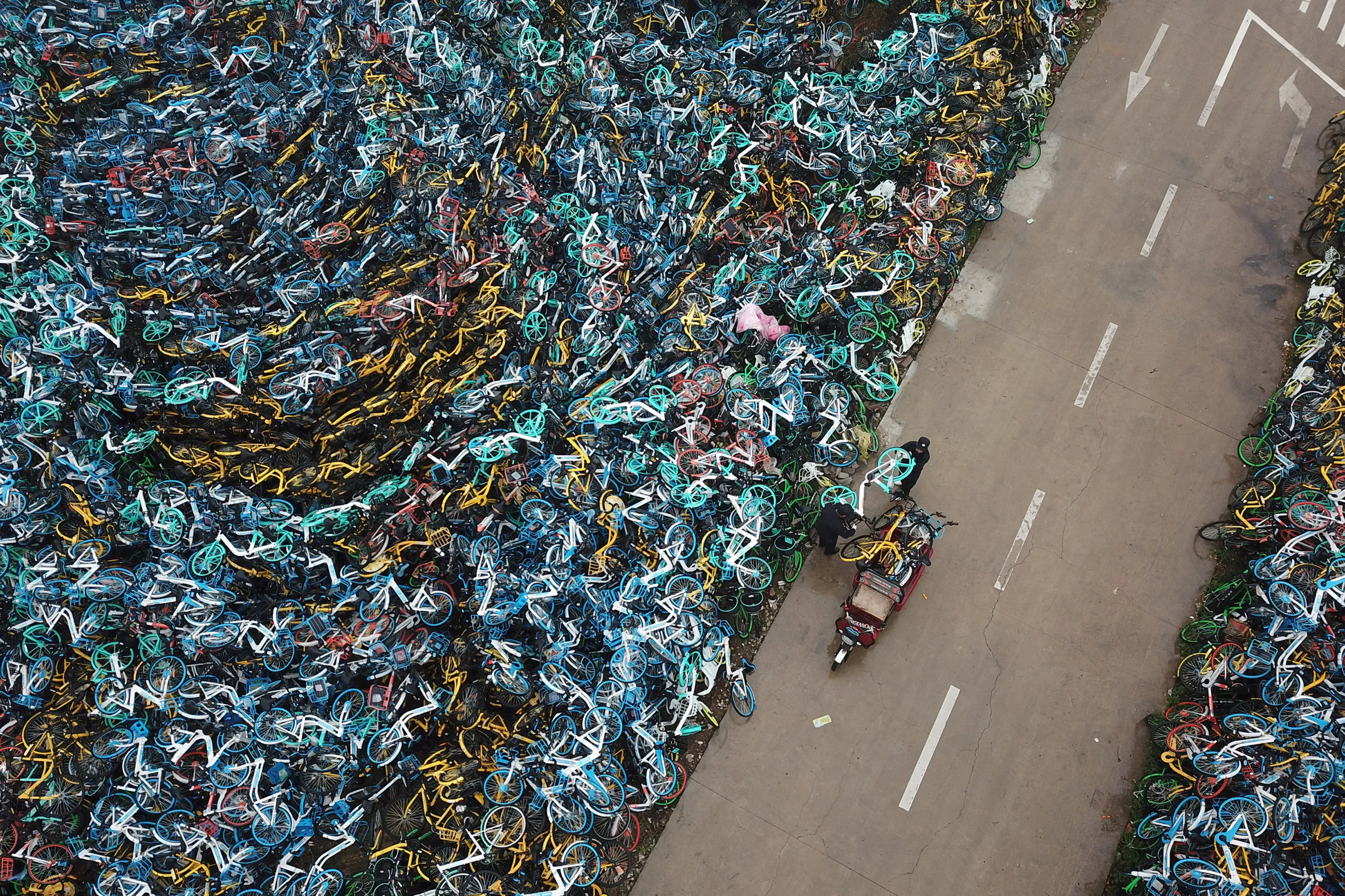 Urban management officers transport a bicycle next to piled-up bicycles of bike-sharing services in Hefei, Anhui province, China December 3, 2018. (Photo by Reuters/China Stringer Network)