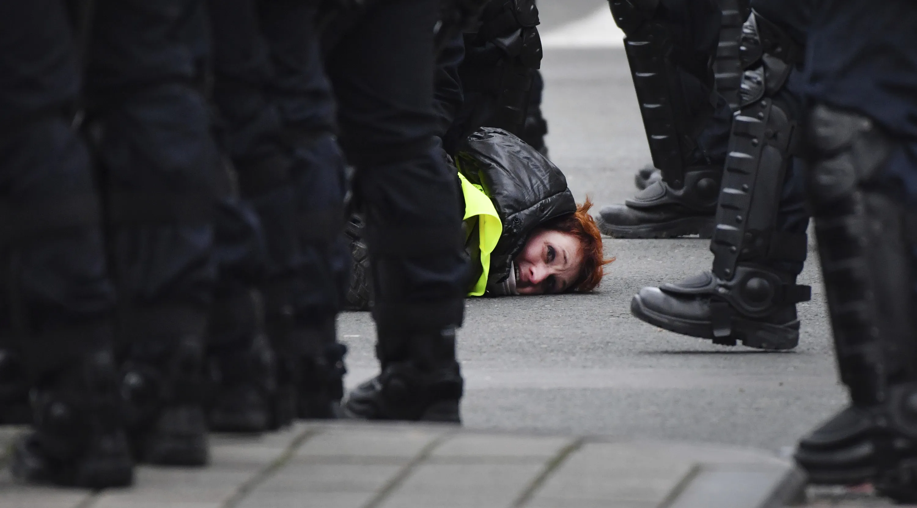 A woman in a yellow vest is detained by police during a demonstration in Brussels, Saturday, December 8, 2018. Hundreds of police officers are being mobilized in Brussels Saturday, where yellow vest protesters last week clashed with police and torched two police vehicles. More than 70 people were detained. (Photo by Geert Vanden Wijngaert/AP Photo)