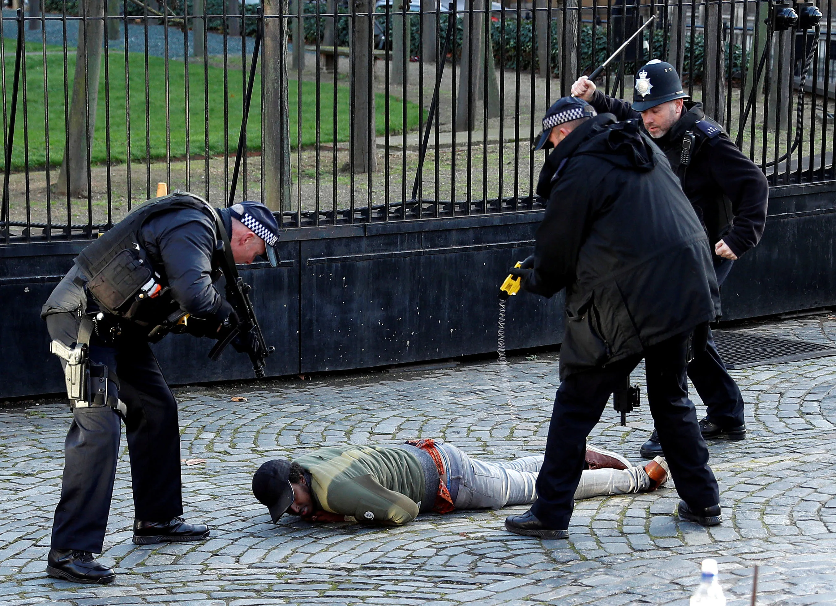 Armed police taser a man inside the grounds of the Houses of Parliament in London, Britain, December 11, 2018. Witnesses reported hearing the man shout: “We're coming for you politicians” as he surged towards the iron gates where PC Palmer was knifed in a terror attack March last year. (Photo by Peter Nicholls/Reuters)