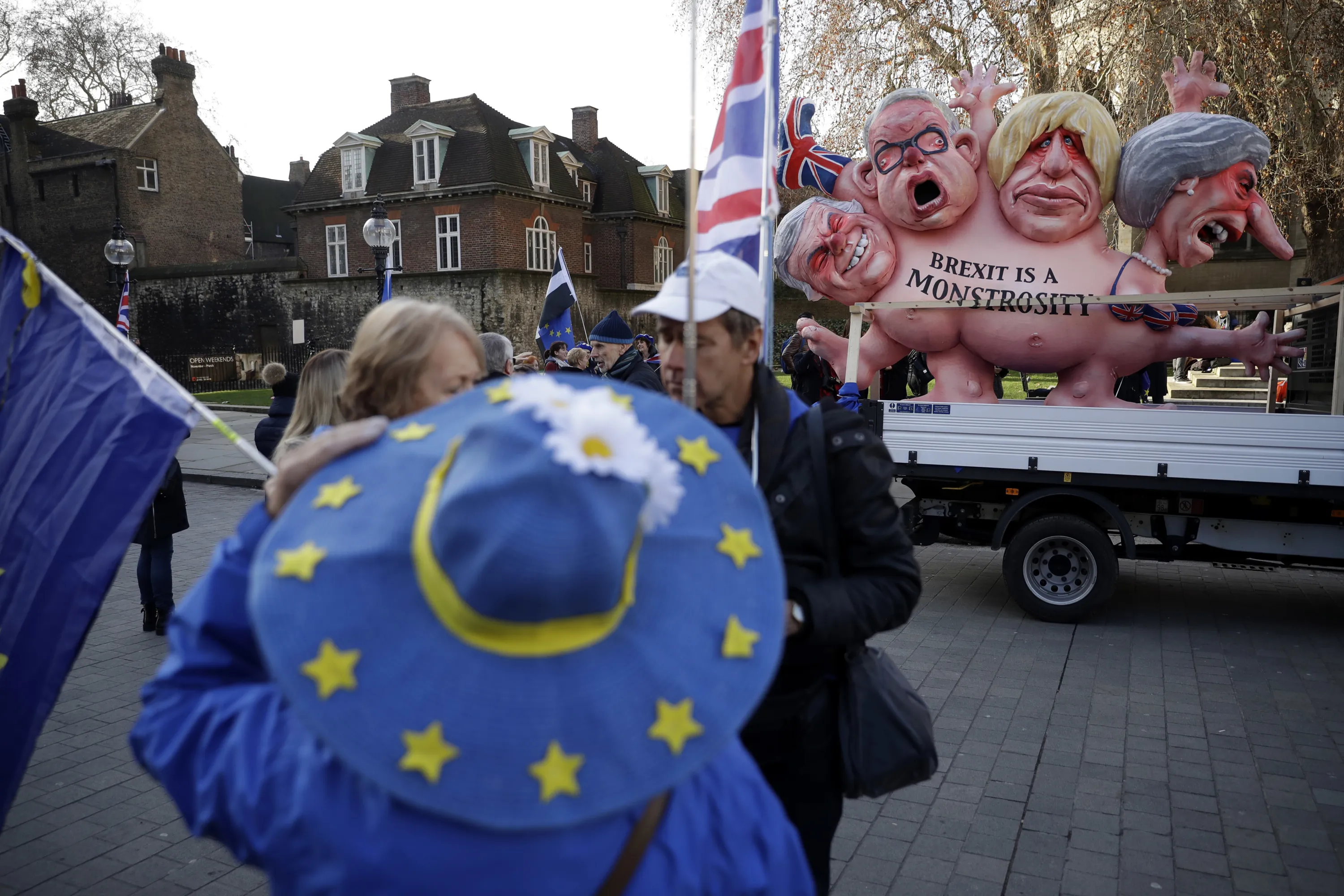 A remain in the European Union, anti-brexit sculpture is displayed as a protester wearing a European flag design hat stands demonstrating in the foreground across the street from the House of Parliament in London, Tuesday, December 11, 2018. Top European Union officials are ruling out any renegotiation of the divorce agreement with Britain as Prime Minister Theresa May fights to save her Brexit deal by lobbying leaders in Europe's capitals. (Photo by Matt Dunham/AP Photo)