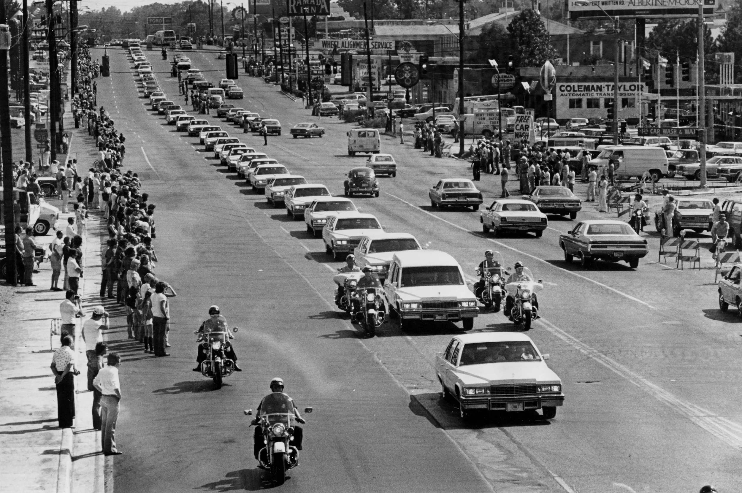 A string of white vehicles follow the hearse carrying the body of rock and roll musician Elvis Presley along Elvis Presley Boulevard on the way to Forest Hills Cemetery in Memphis, Tenn., August 19, 1977. Thousands of people line the route for the city's final tribute to Elvis. (Photo by AP Photo)
