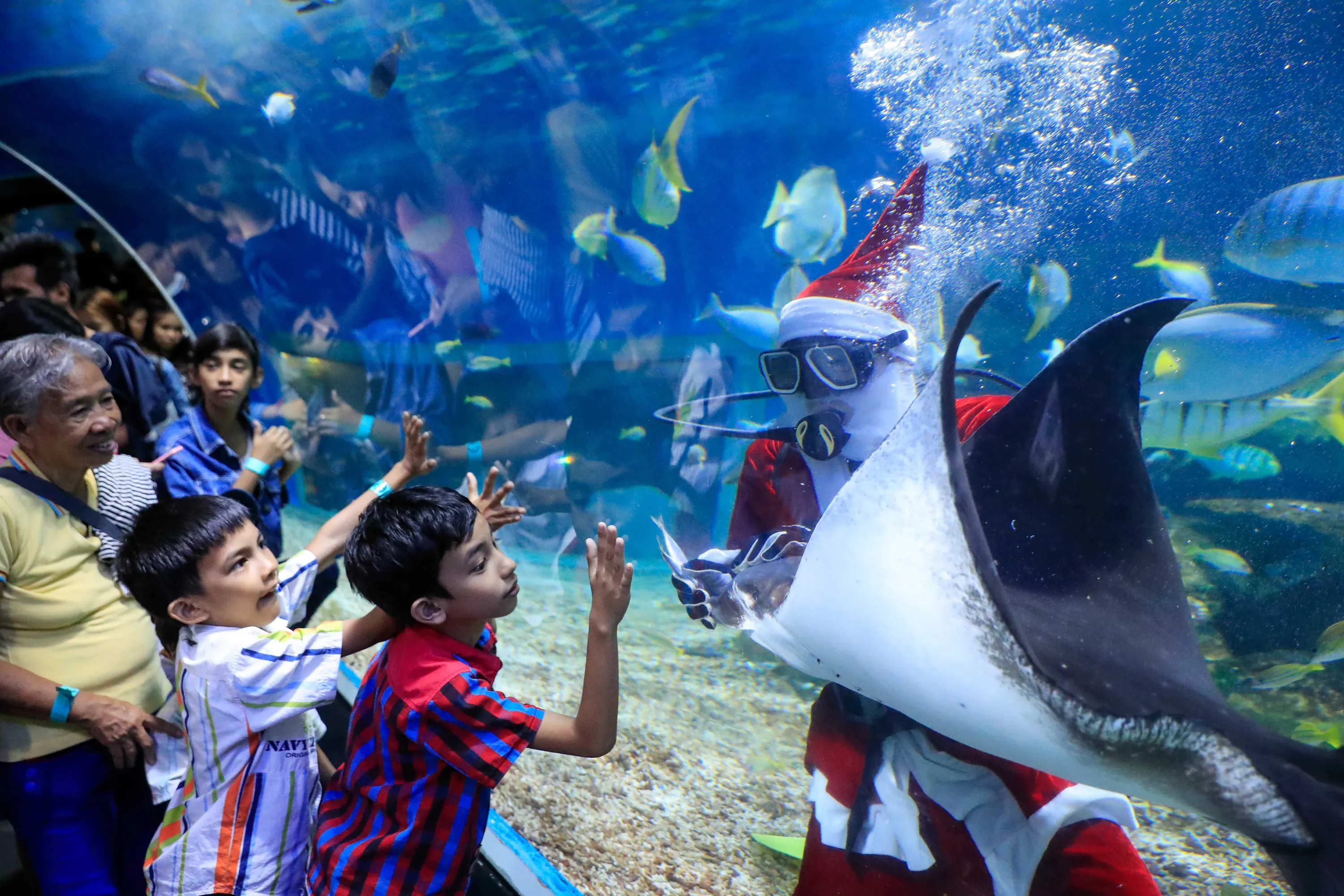 A diver dressed as Santa Claus feeds a marine animal as children look on at the Manila Ocean Park in Manila, Philippines, 14 December 2018. The activity served as a Christmas attraction for the season. (Photo by Mark R Cristino/EPA/EFE)