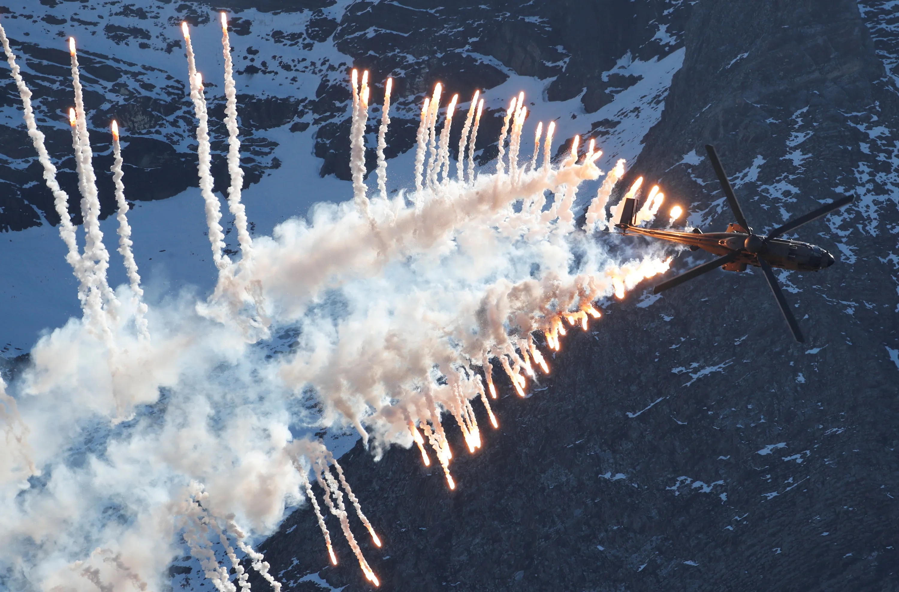 A Swiss Air Force Super Puma Cougar helicopter releases flares during a flight demonstration over the Axalp in the Bernese Oberland, Switzerland on October 10, 2018. (Photo by Arnd Wiegmann/Reuters)