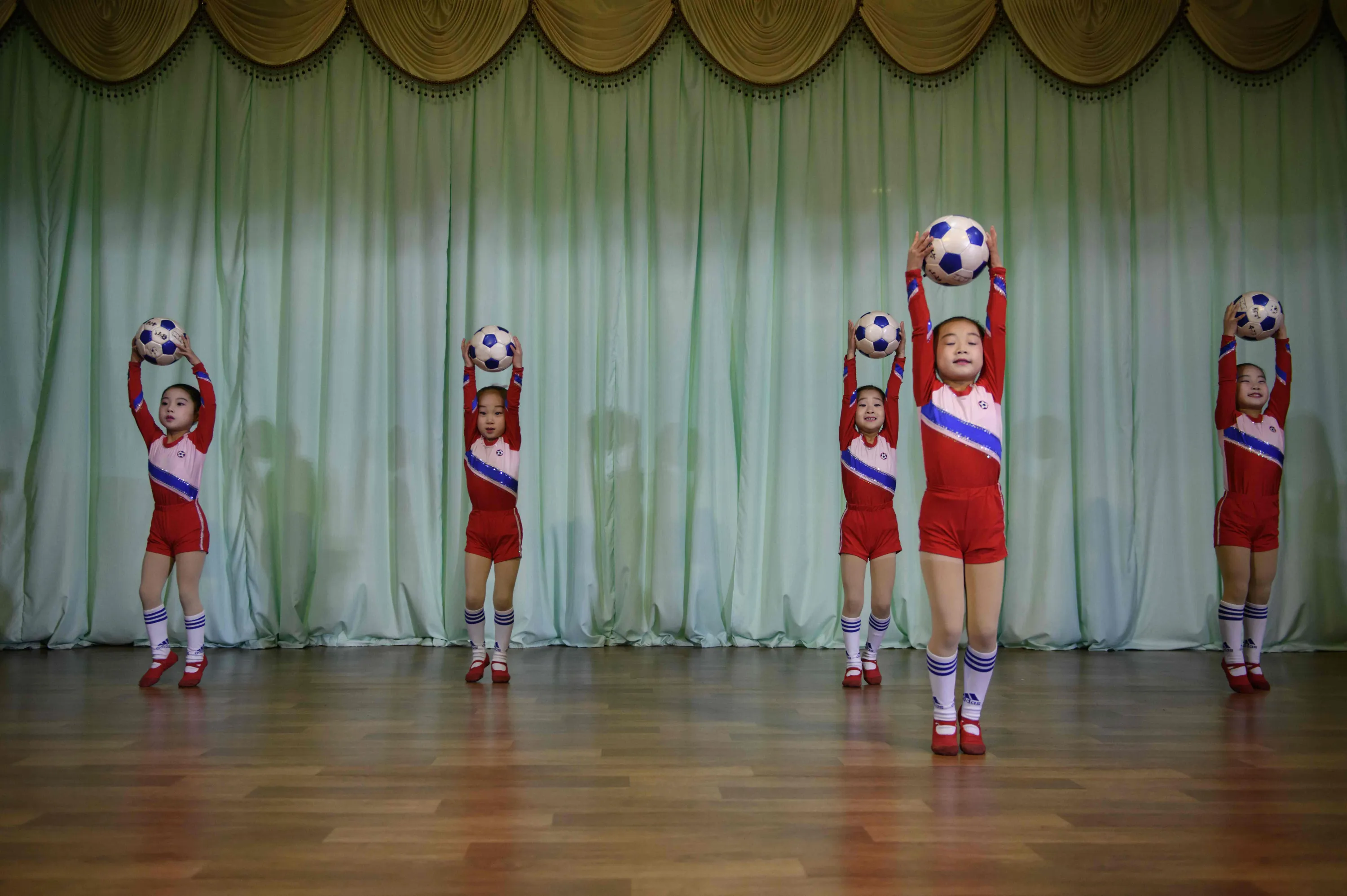 In a photo taken on December 1, 2018 children perform with footballs at the Sinuiju City Kindergarten in North Korea's border city of Sinuiju. Lined up in vividly-coloured costumes, make-up and bright smiles, the children of the Sinuiju City Kindergarten belted out the finale of their hour-long show, “We Cannot Live Without You, Father” – an ode to Kim Jong Un. (Photo by Ed Jones/AFP Photo)
