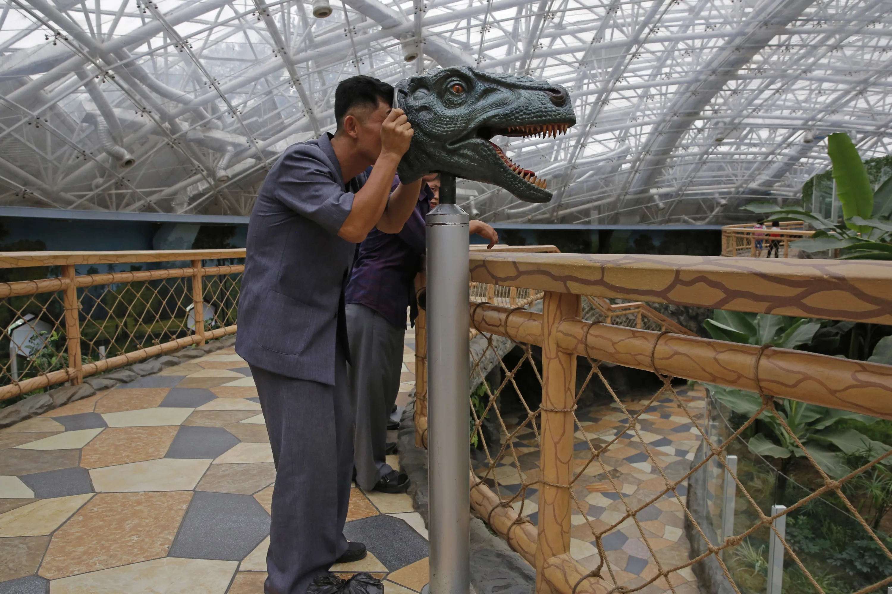 In this Saturday, September 15, 2018, file photo, a North Korean man looks through a device to study the vision of a dinosaur, at the Central Zoo in Pyongyang, North Korea. (Photo by Kin Cheung/AP Photo)