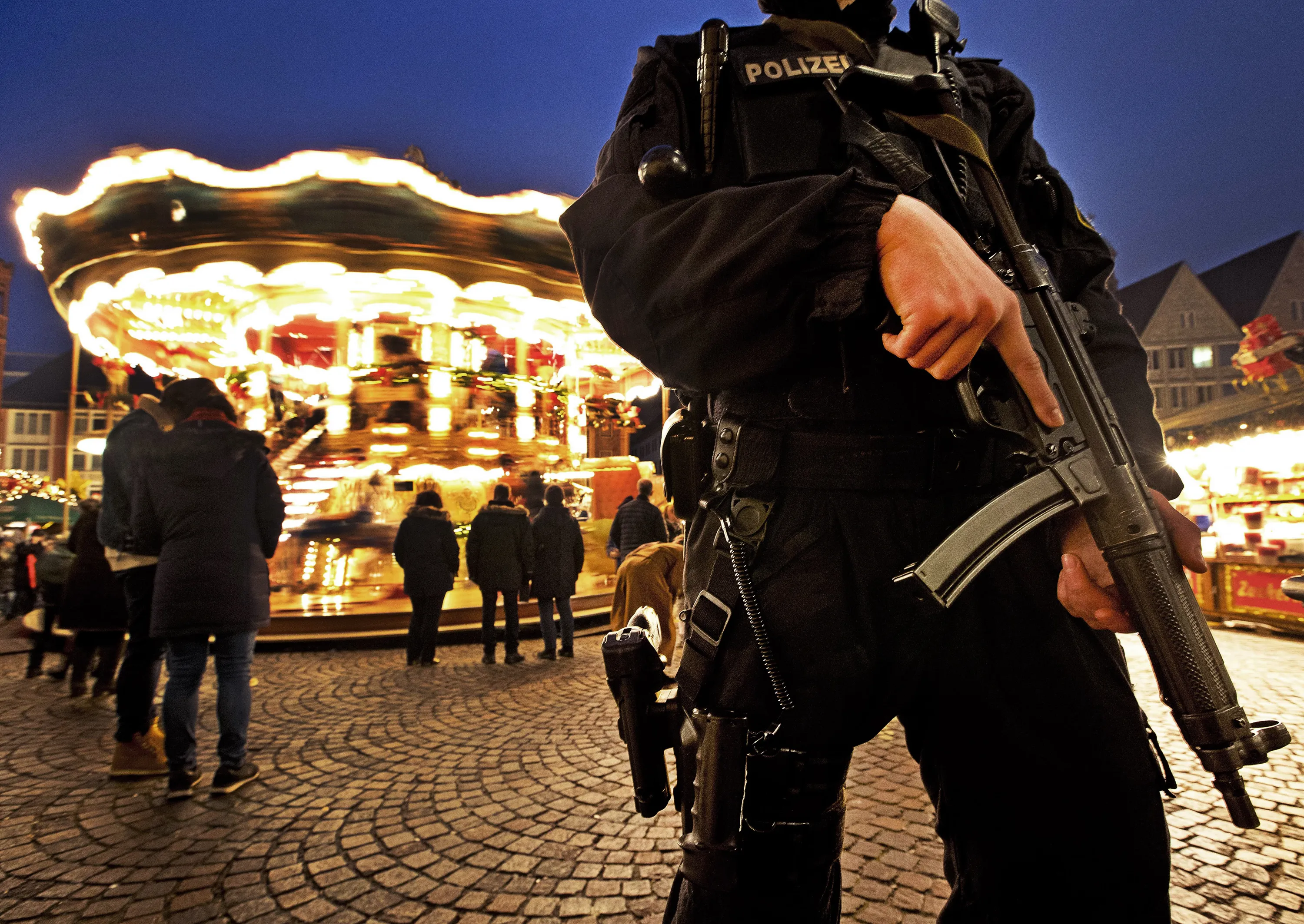 A German police officer stands near a merry-go-round guarding the Christmas market in Frankfurt, Germany, Monday, December 17, 2018. (Photo by Michael Probst/AP Photo)